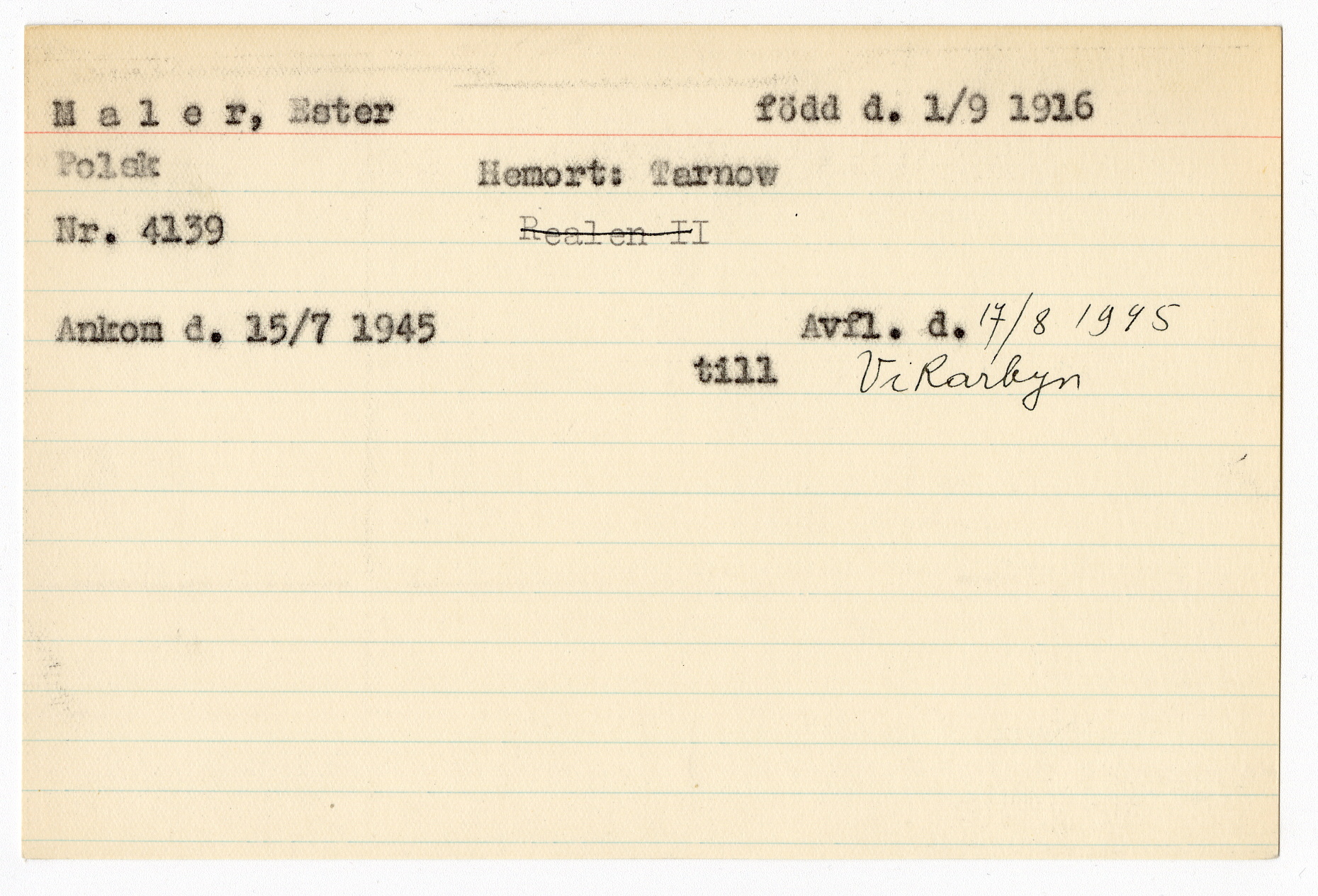 Registerkort Ester Maler