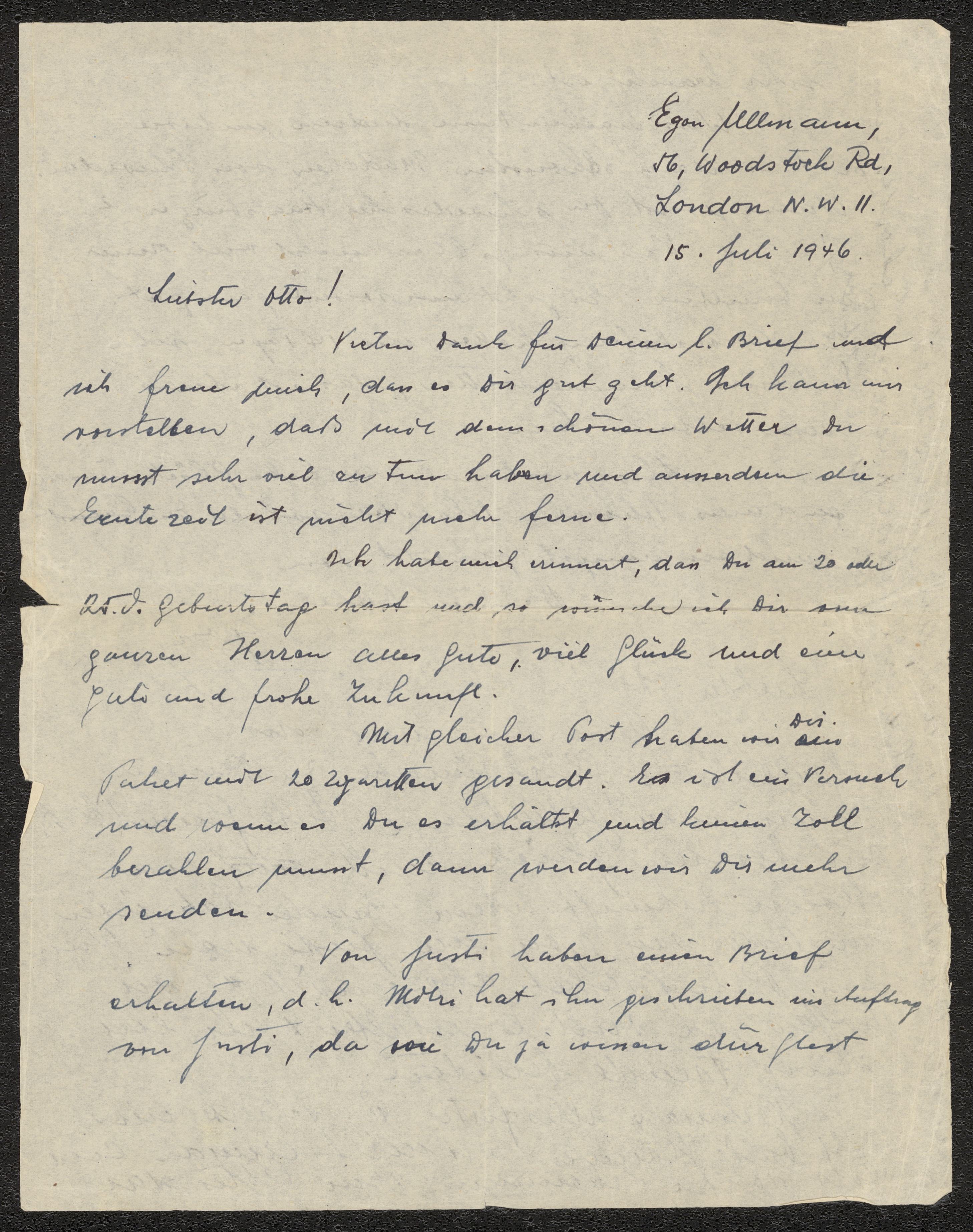 Brev till Otto Ullman från farbror Egon Ullmann och faster Alice "Lizzy" Ullmann daterat 15 juli 1946 London.