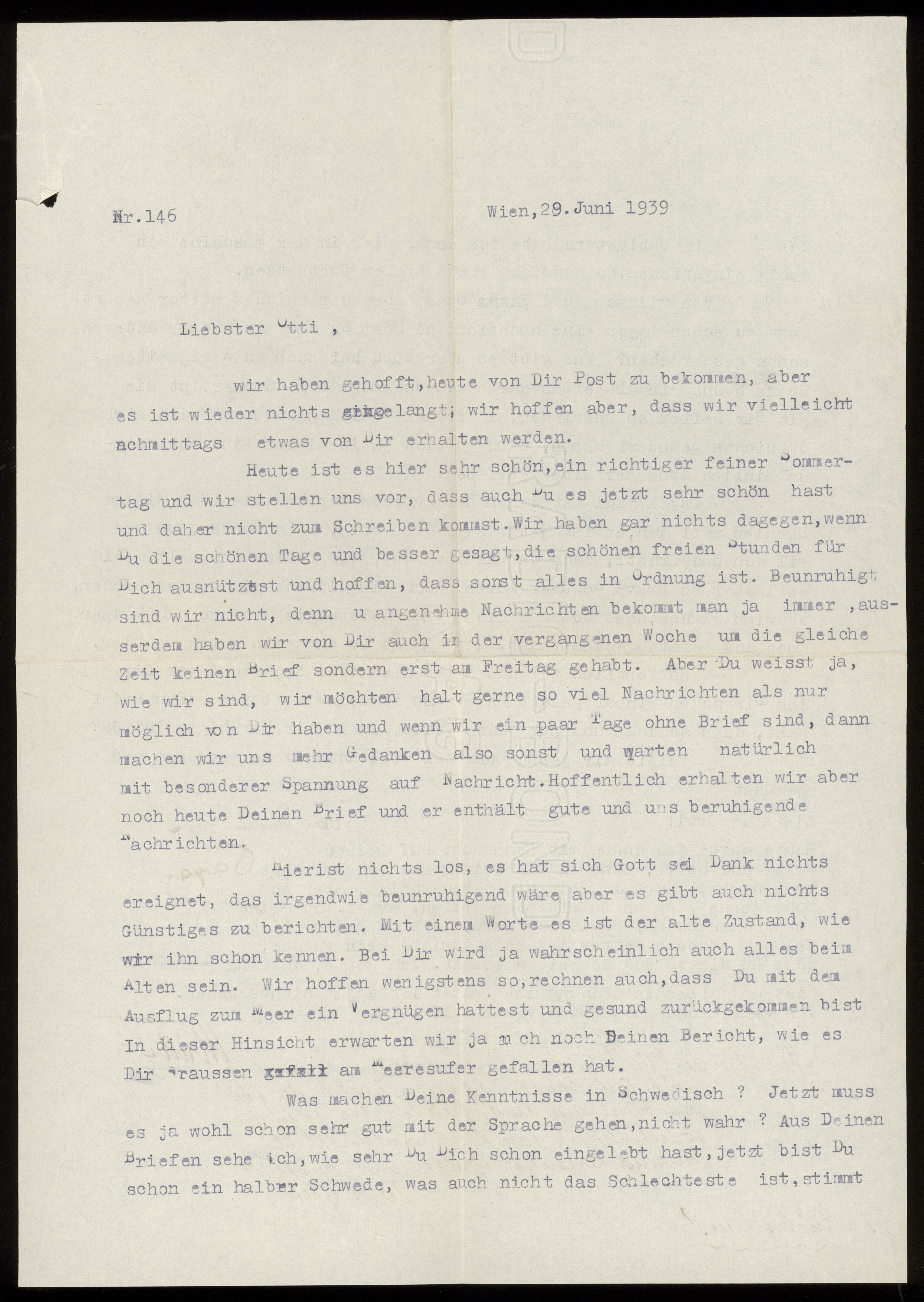 Maskinskrivet brev till Otto Ullman från föräldrarna Josef och Elise Ullmann och moster Grete Kollmann daterat 29 juni 1939 Wien.