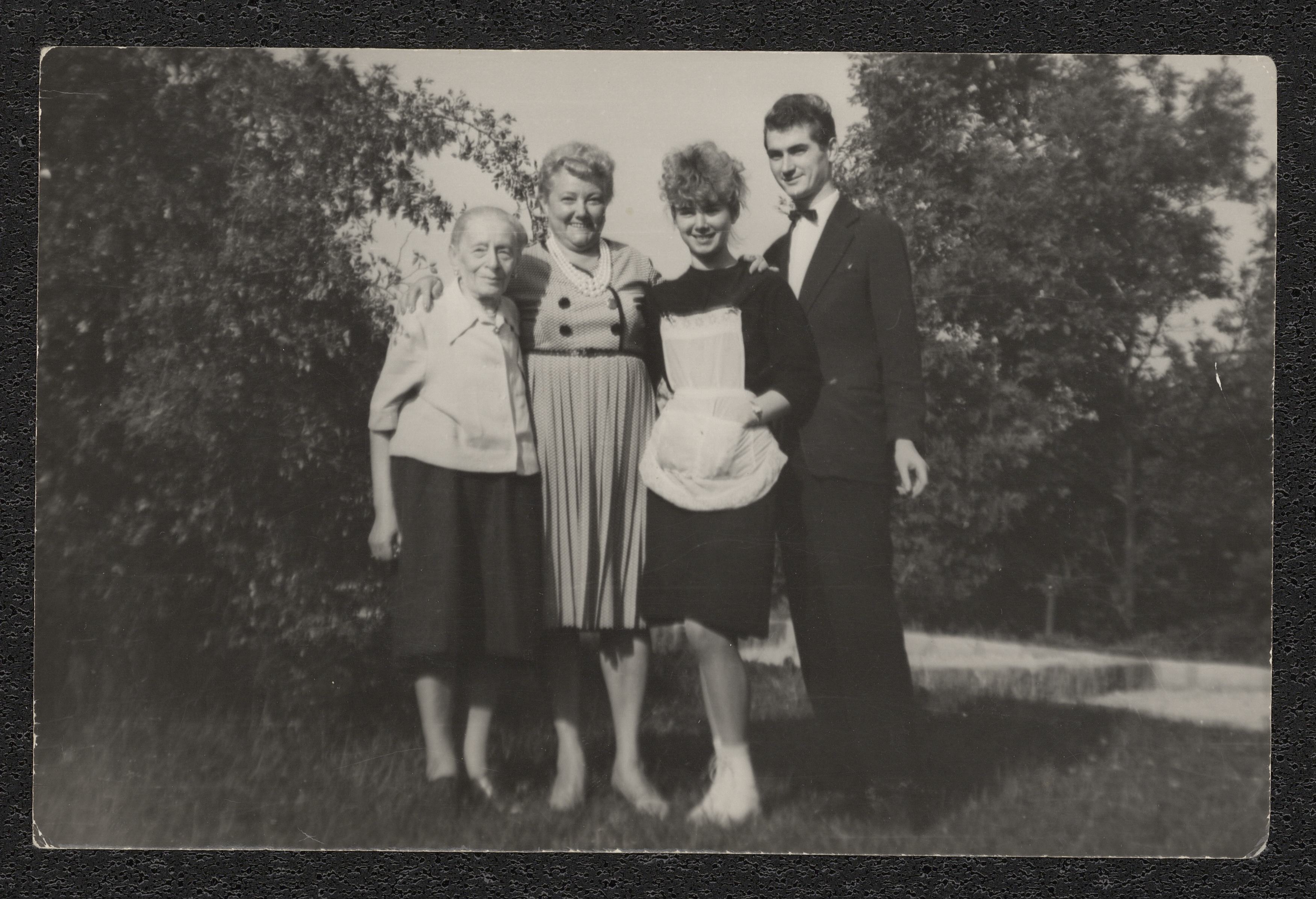 Fotografi av fyra personer. På baksidan finns anteckningen "tant Magda längst tv". Fotografiet har tillhört Georg Witt.