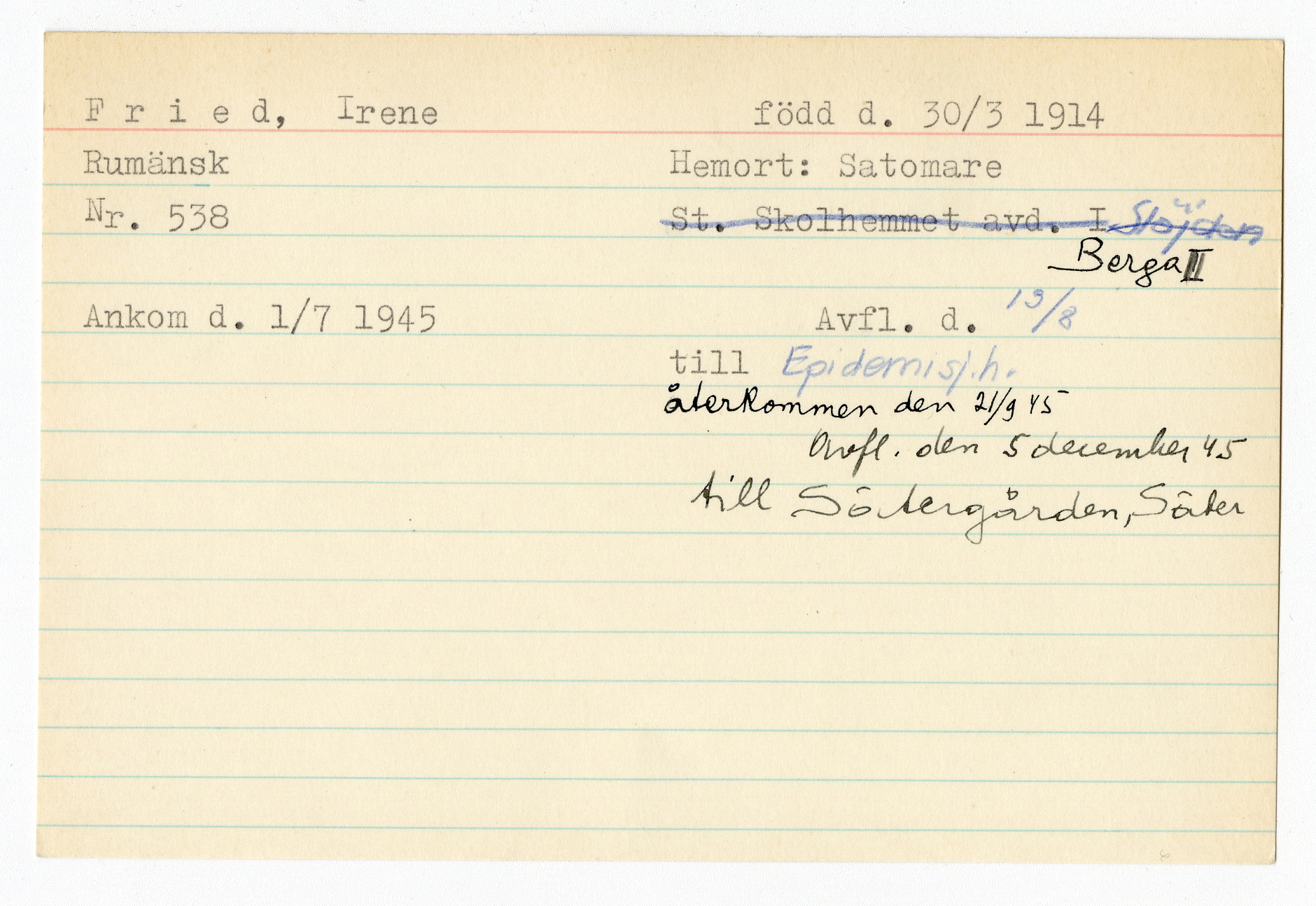 Registerkort Irene Fried
