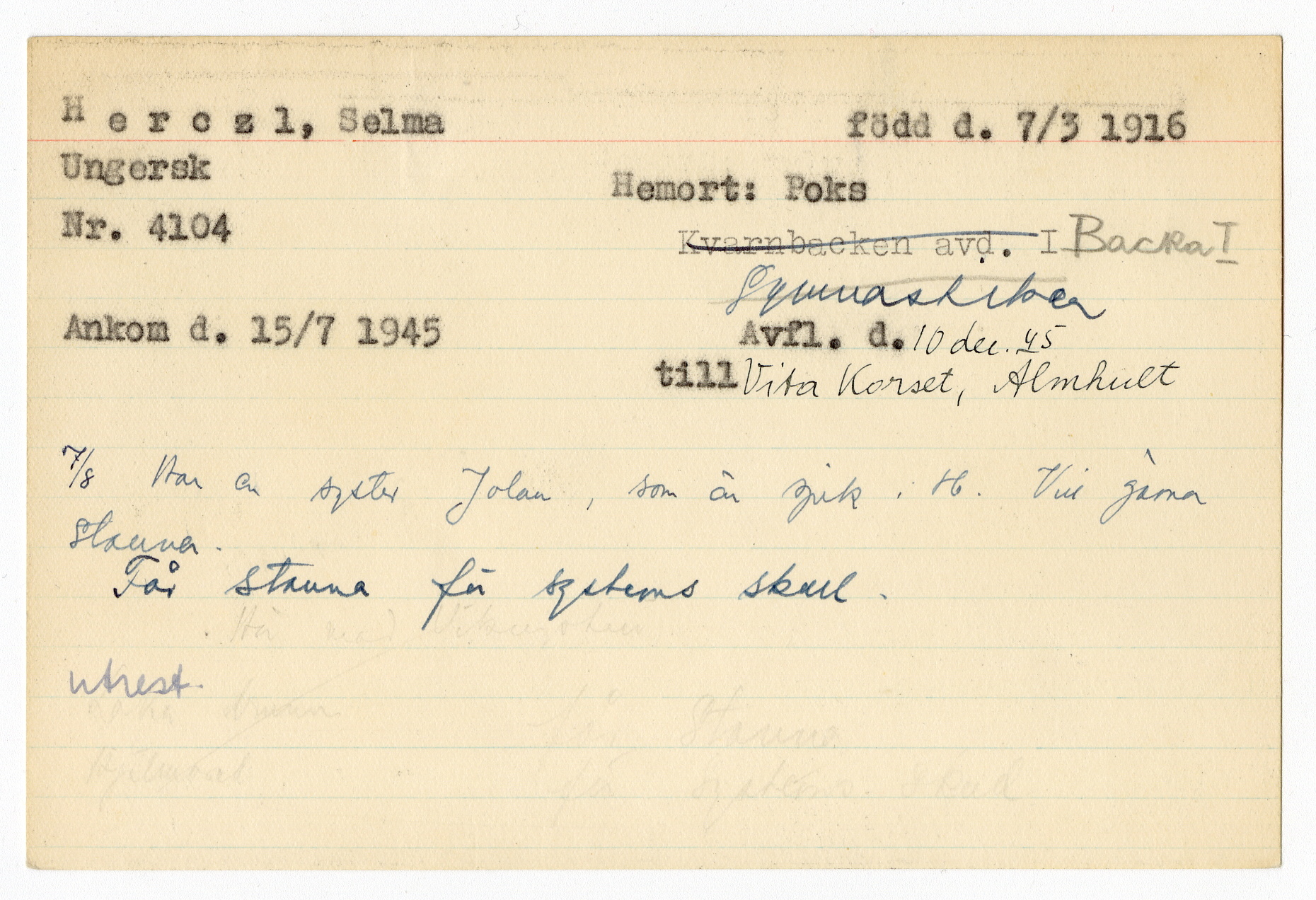Ett skrivkort med patientuppgifter gällande Selma Herczl.