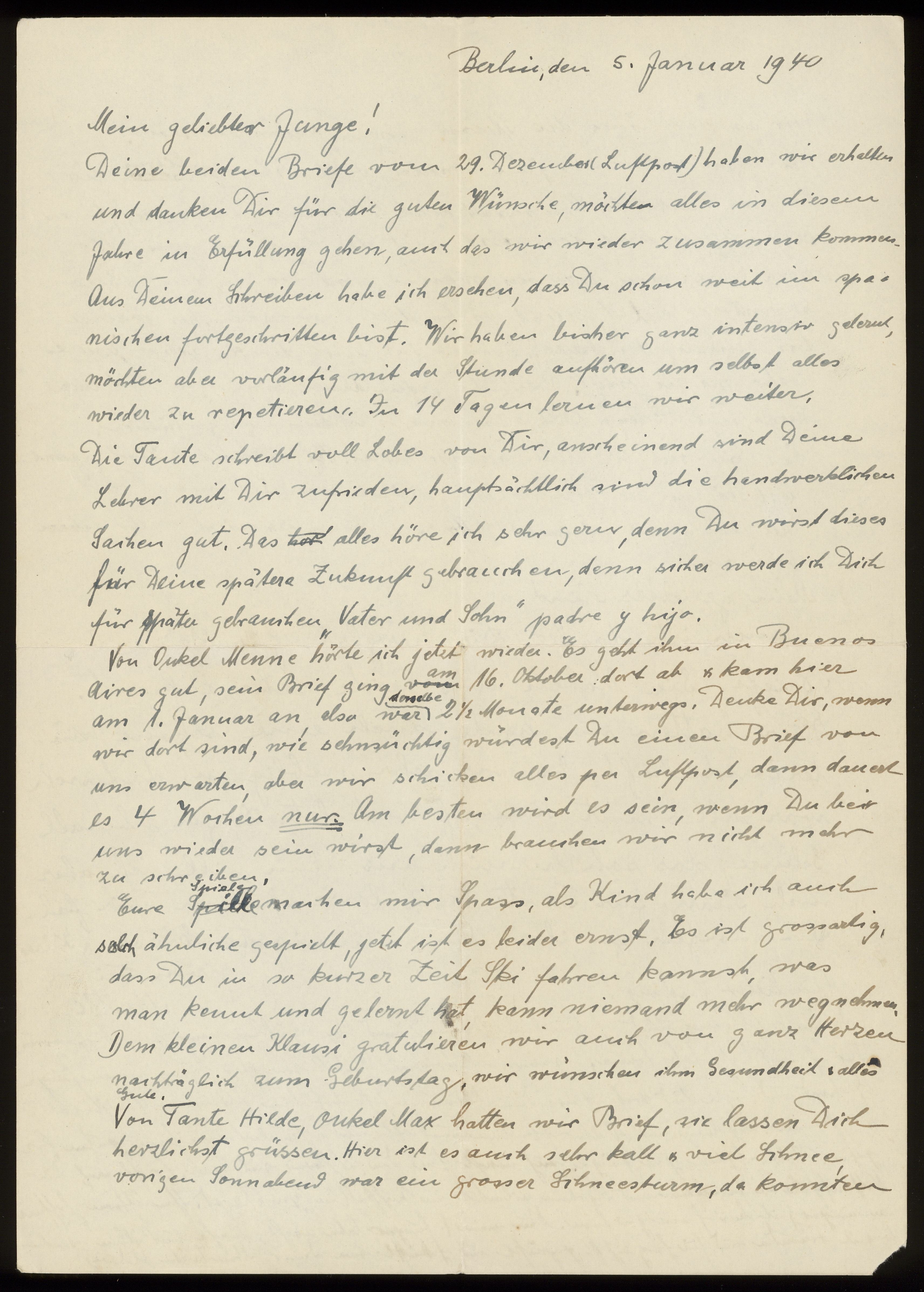 Brev från farmor Hedwig till Ludwig Posner daterat 5 januari 1940.