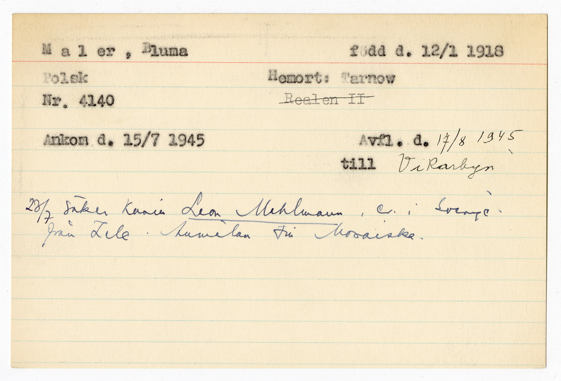 Ett skrivkort med patientuppgifter gällande Bluma Maler.