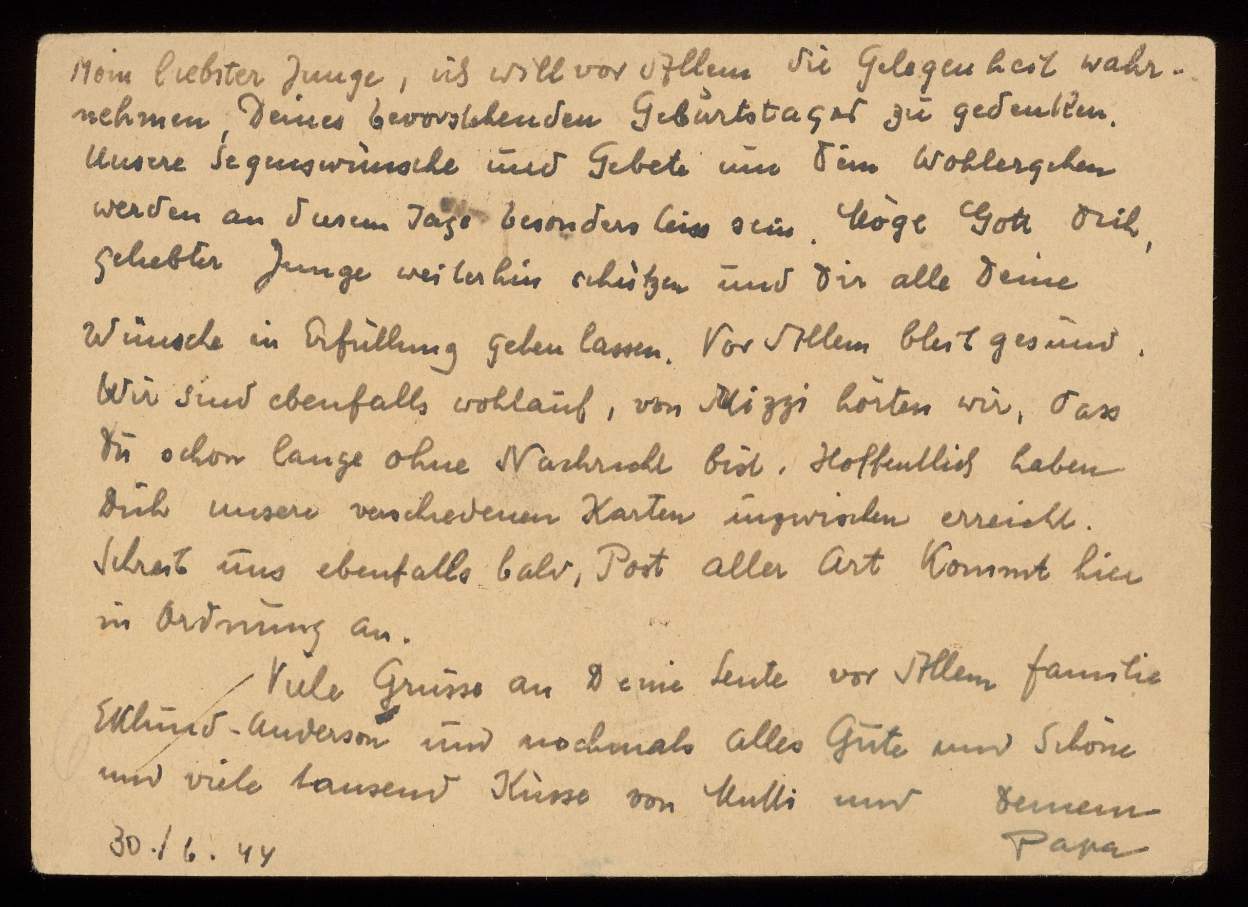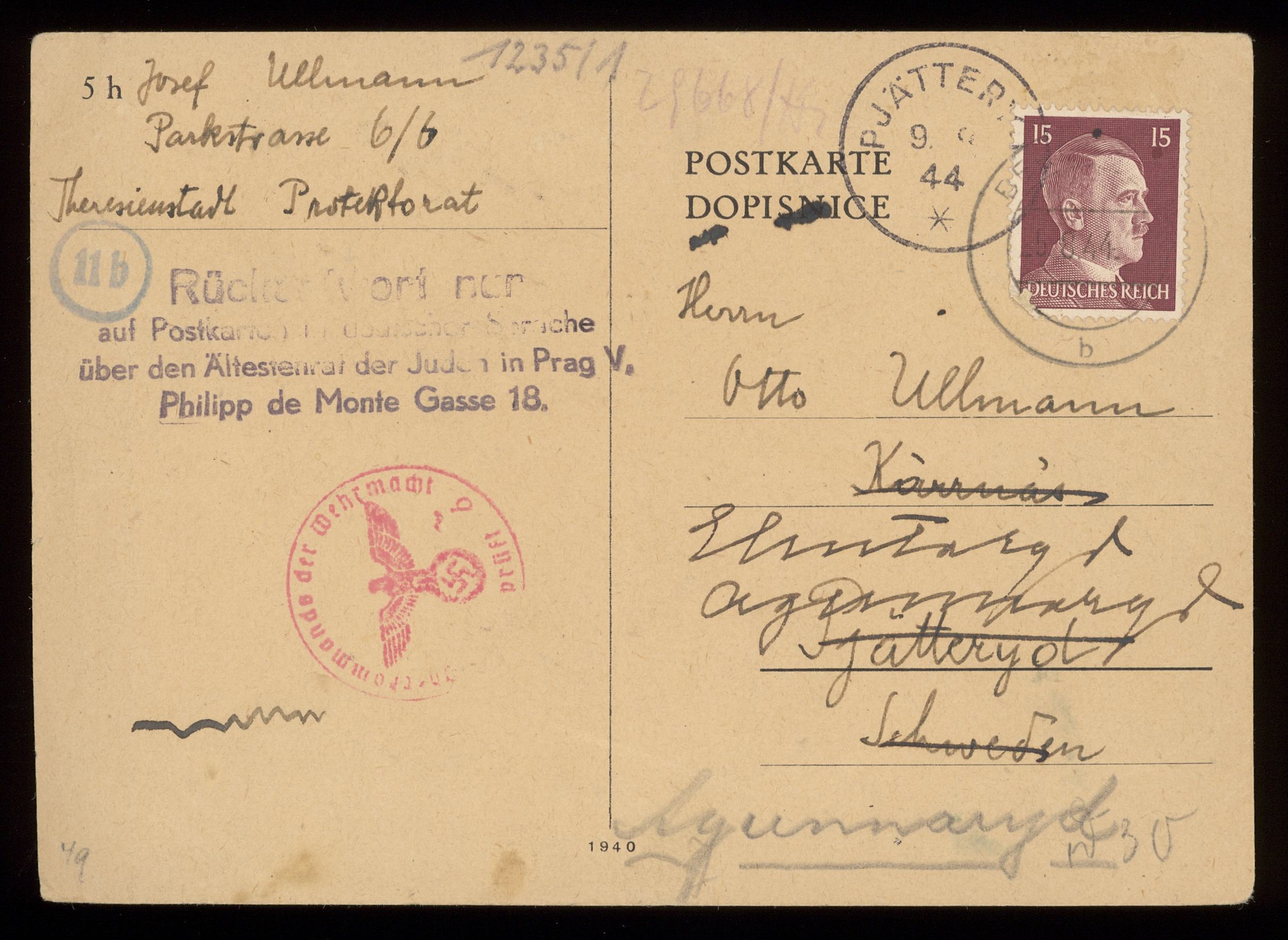 Brev till Otto Ullman från föräldrarna Josef och Elise Ullmann daterat 30 juni 1944 Theresienstadt.