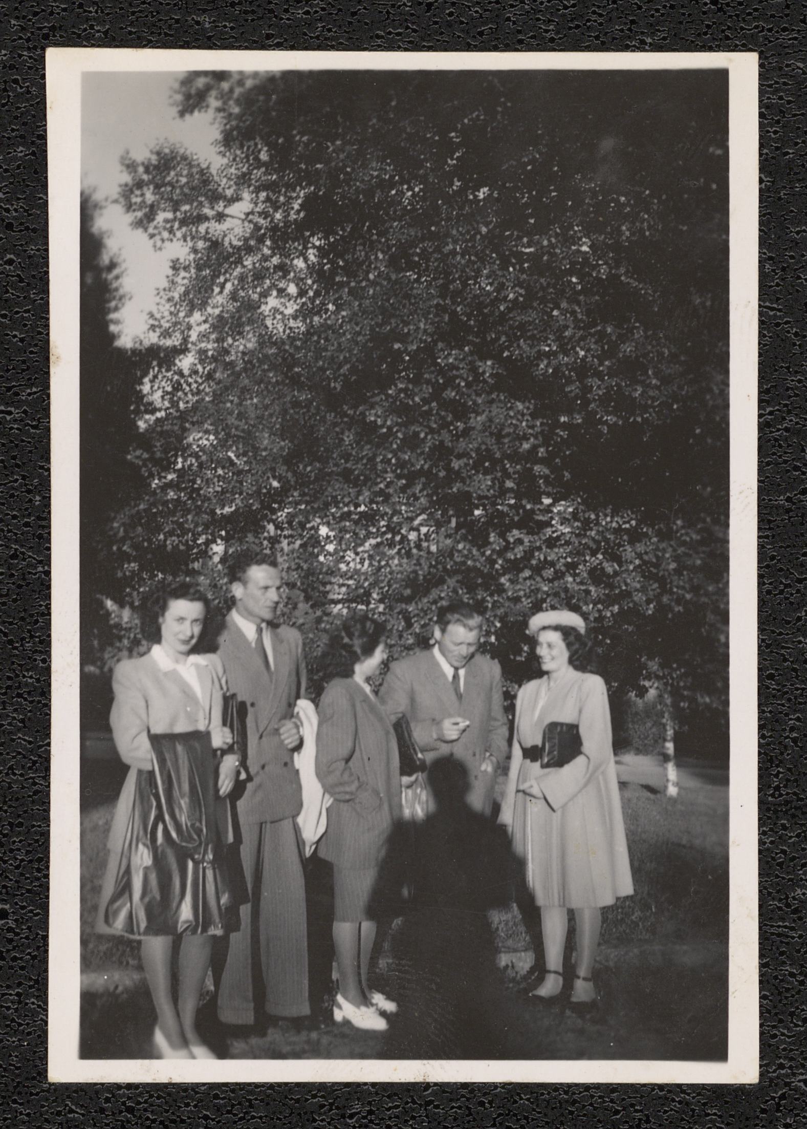 Tre unga kvinnor och två män står i en park, det förefaller vara sommar. Kvinnan i mitten är möjligen Rosa Gustafsson, till vänster om henne väninnan Lucy med maken Frans. Övriga okända.