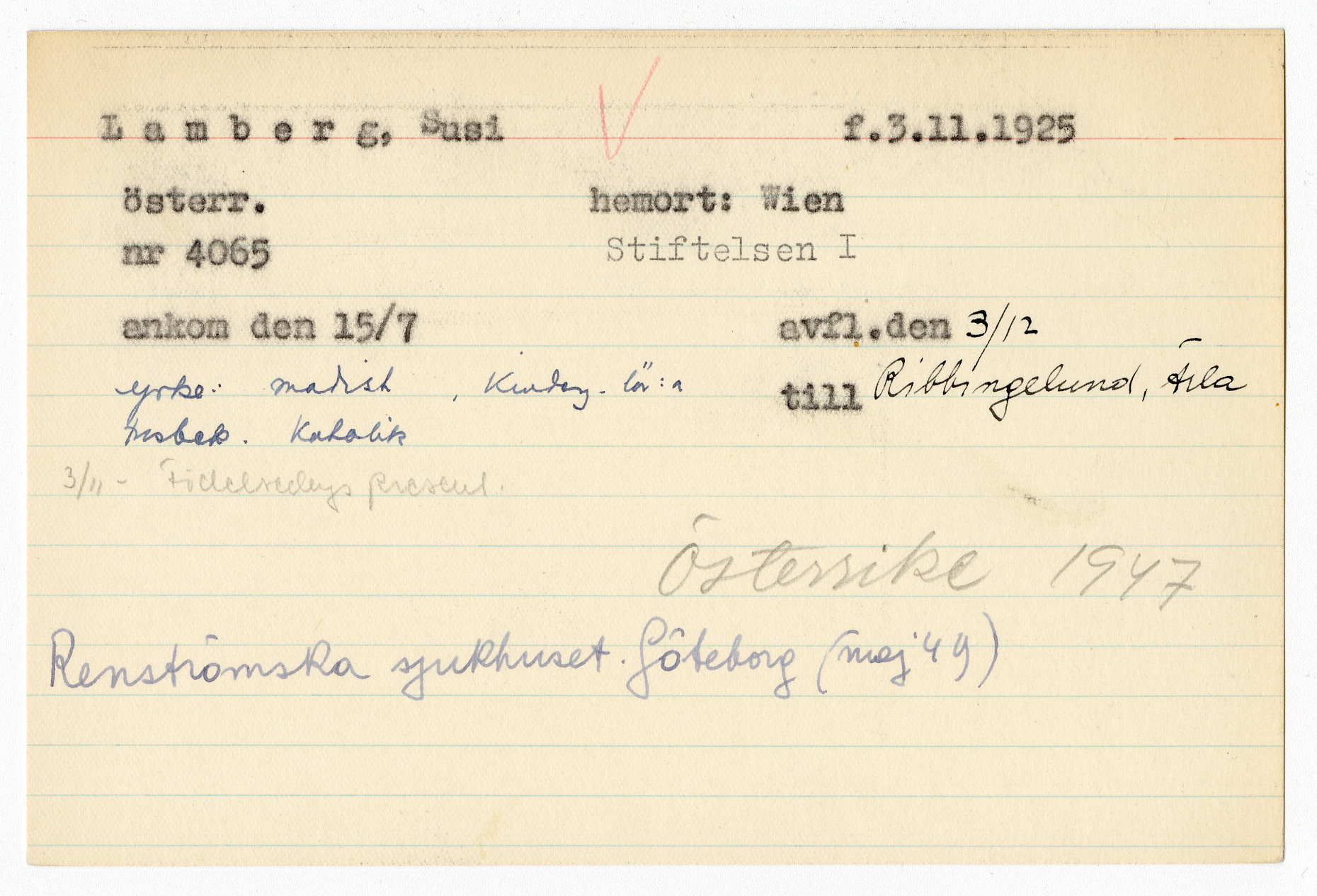 Ett skrivkort med patientuppgifter gällande Susi Lamberg.