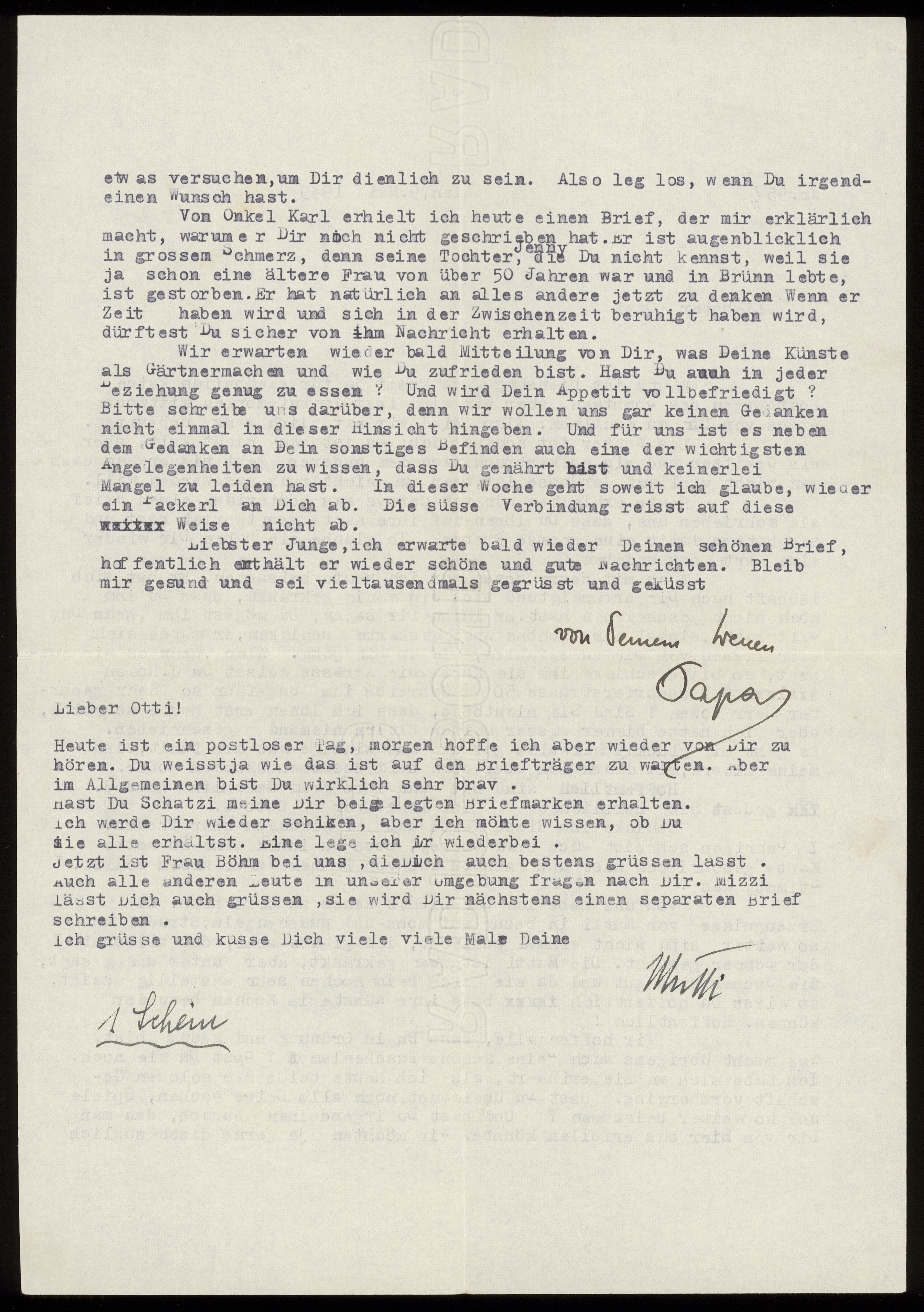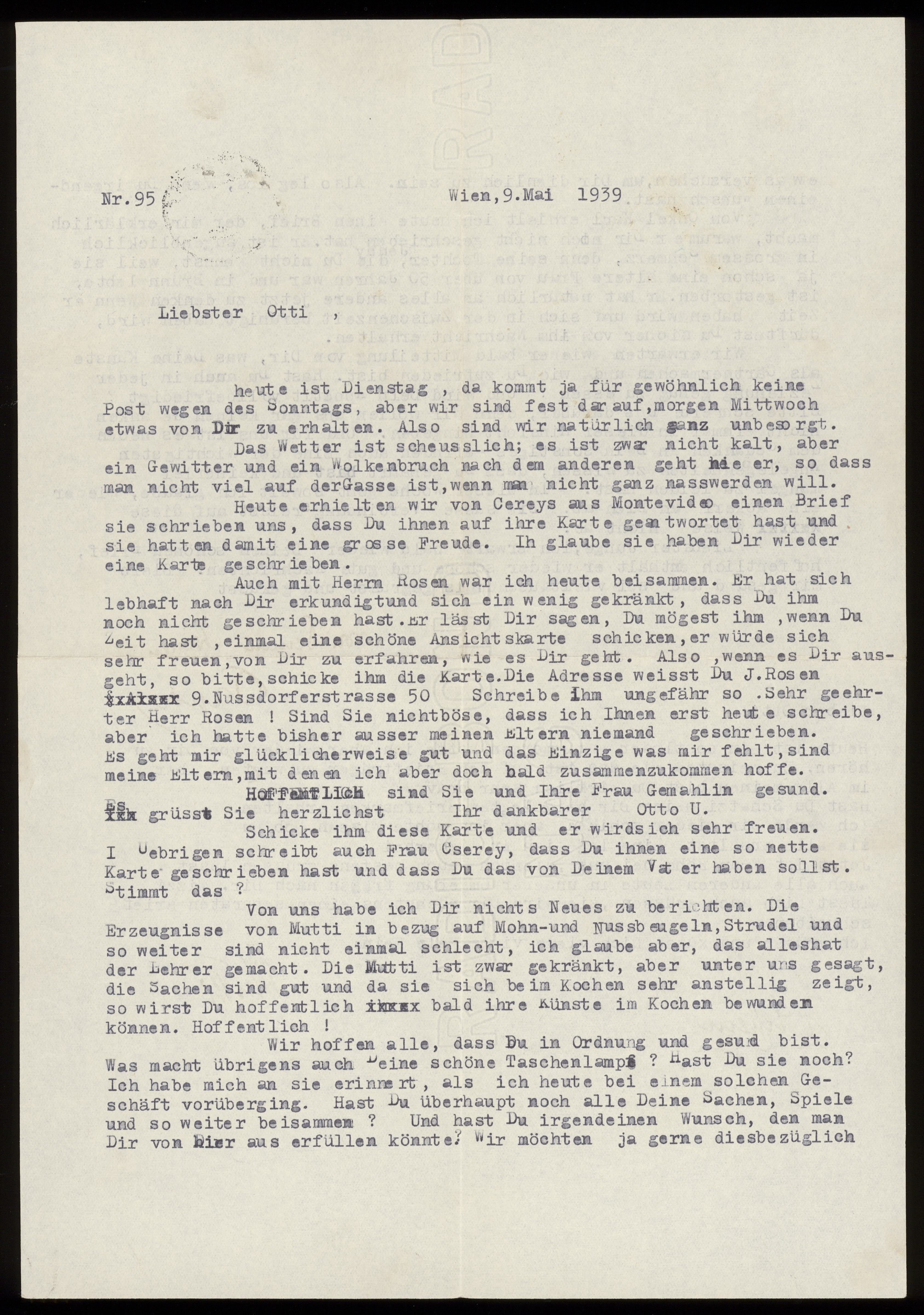 Maskinskrivet brev till Otto Ullman från föräldrarna Josef och Elise Ullmann daterat 9 maj 1939 Wien.