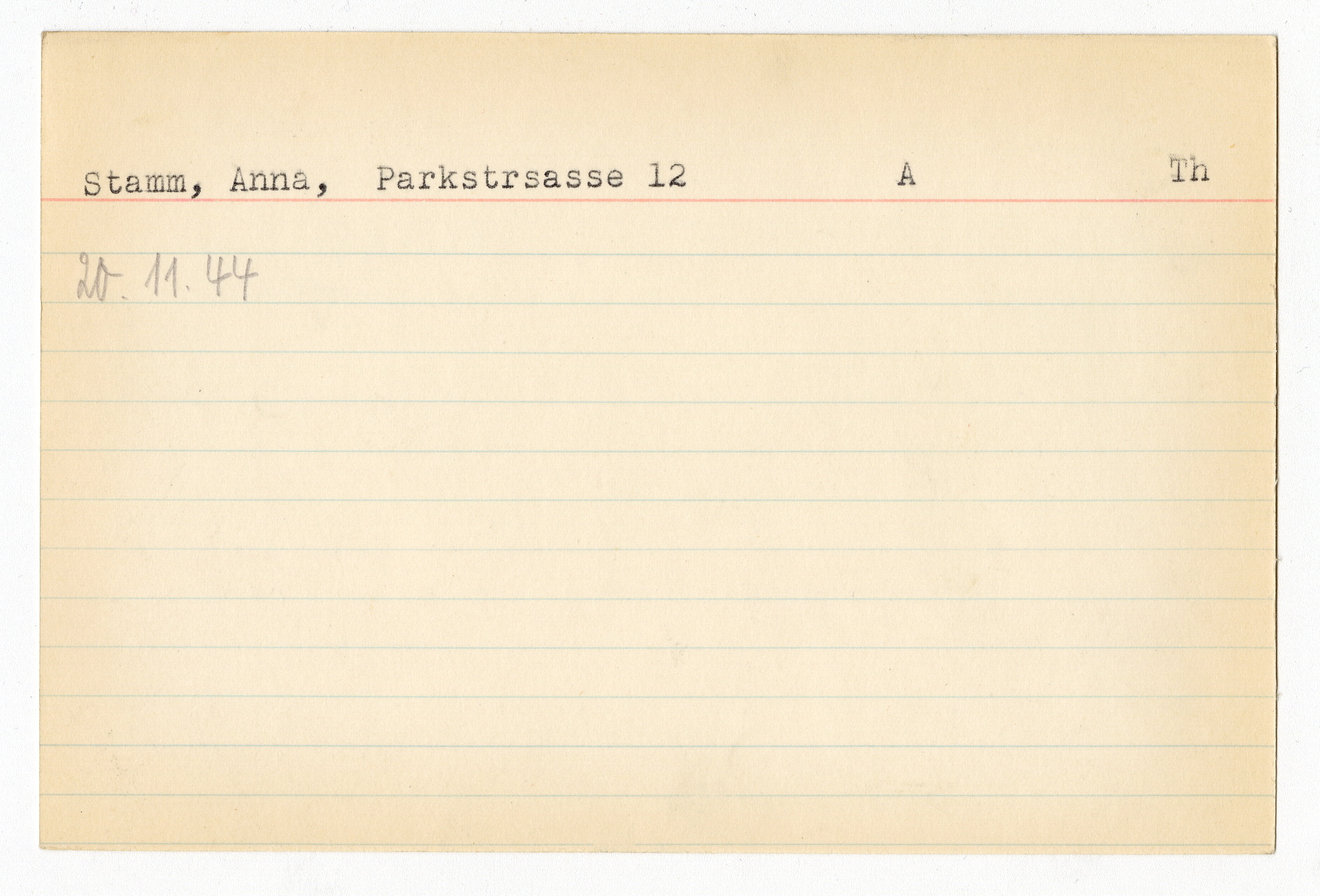Ett skrivkort med patientuppgifter gällande Klara Schwartz. På baksidan uppgifter om matpaket till Anna Stamm i Theresienstadt.