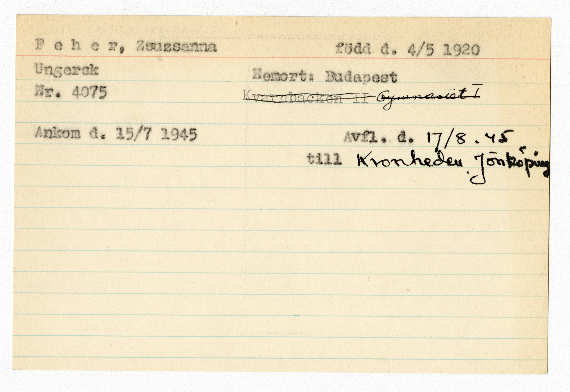 Ett skrivkort med patientuppgifter gällande Zuzsanna Feher.