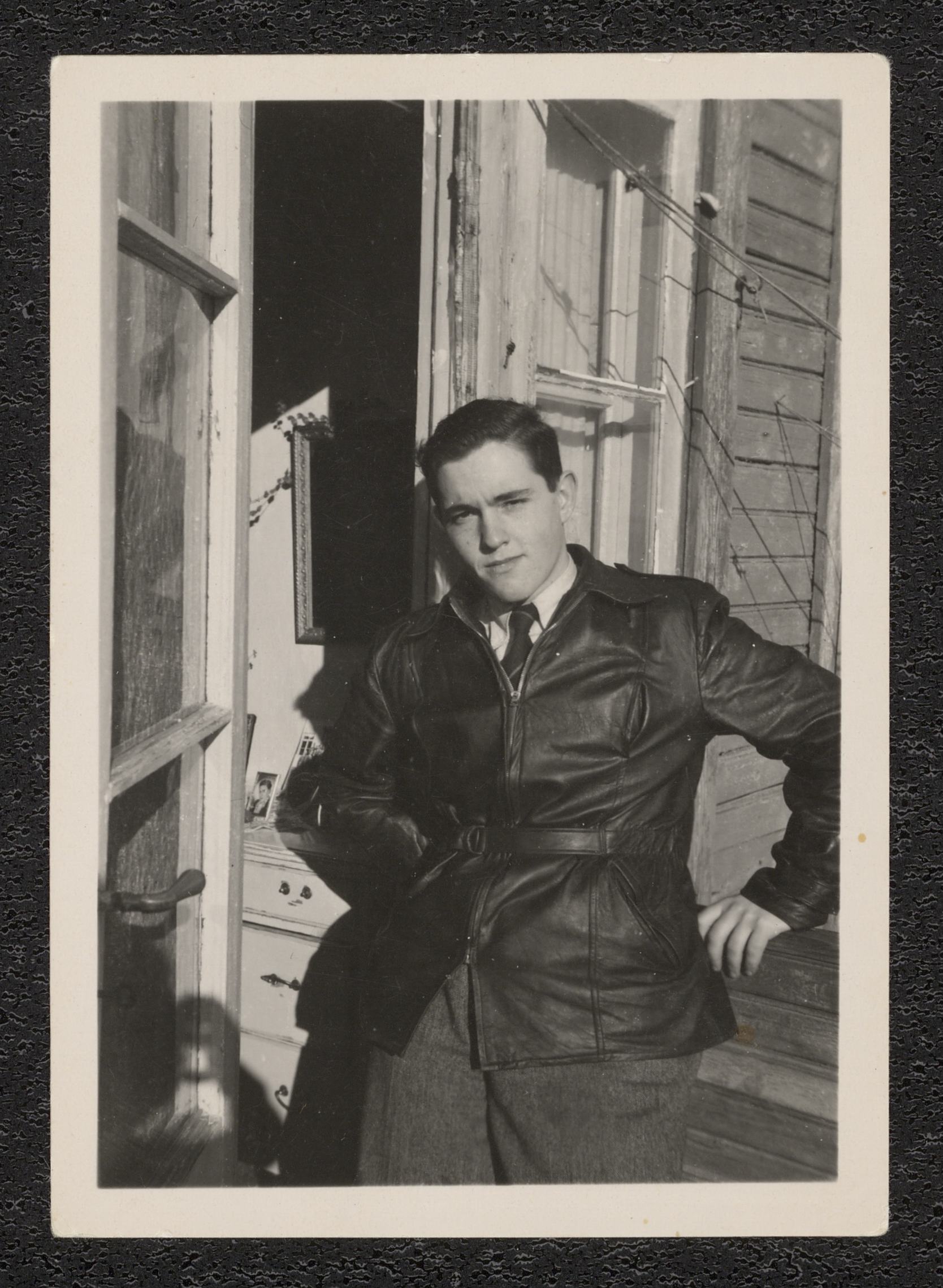 Georg Witt poserar för kameran iklädd läderjacka, lutad mot fasaden på ett trähus.