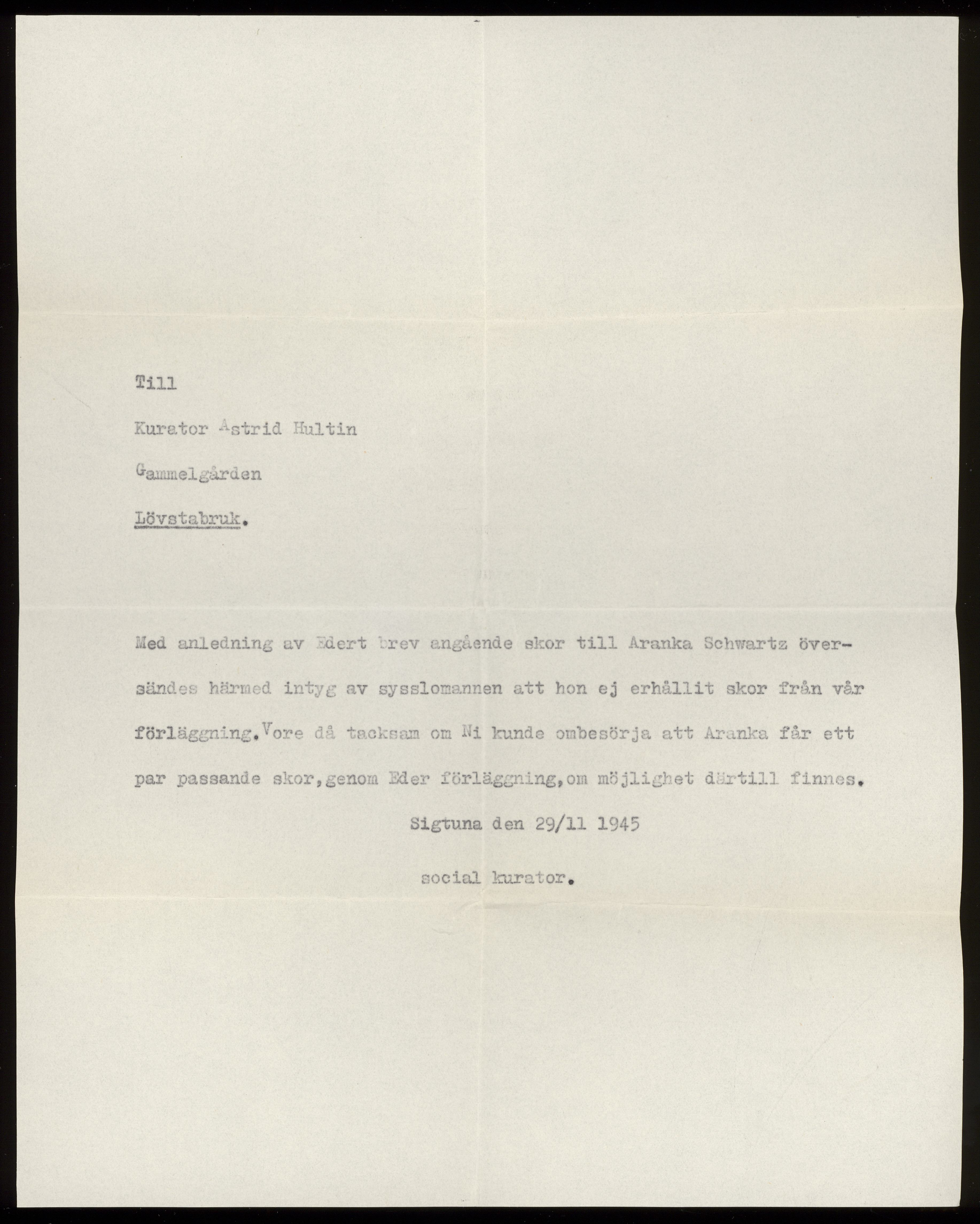 Ett brev från kurator Astrid Hultin på Gammelgården i Lövstabruk till kurator på Sjukhusförläggningarna Sigtuna angående Aranka Schwartz 28 november 1945 Sigtuna.
