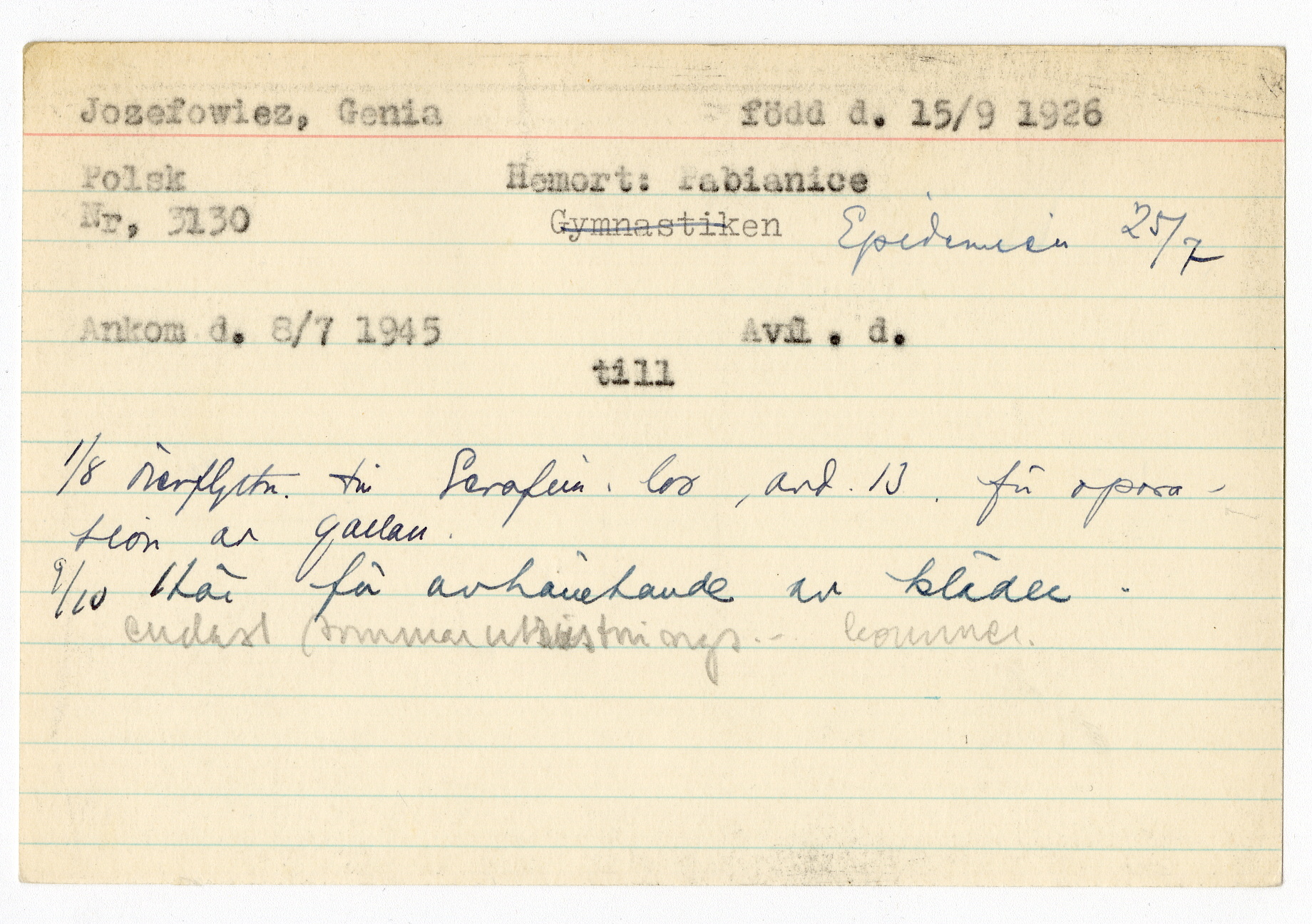 Ett skrivkort med patientuppgifter gällande Genia Josefowlez.