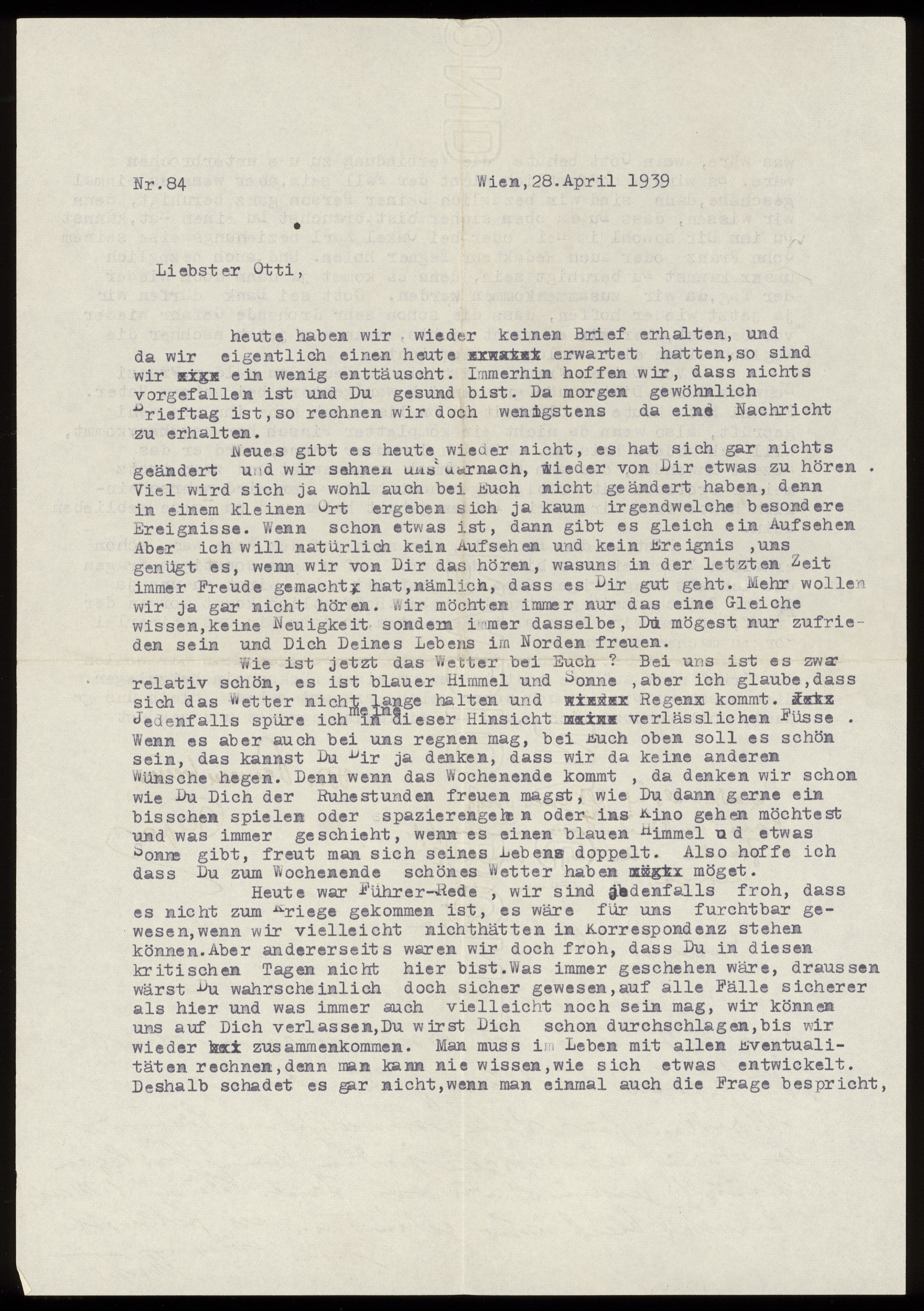 Maskinskrivet brev till Otto Ullman från föräldrarna Josef och Elise Ullmann daterat 28 april 1939 Wien.