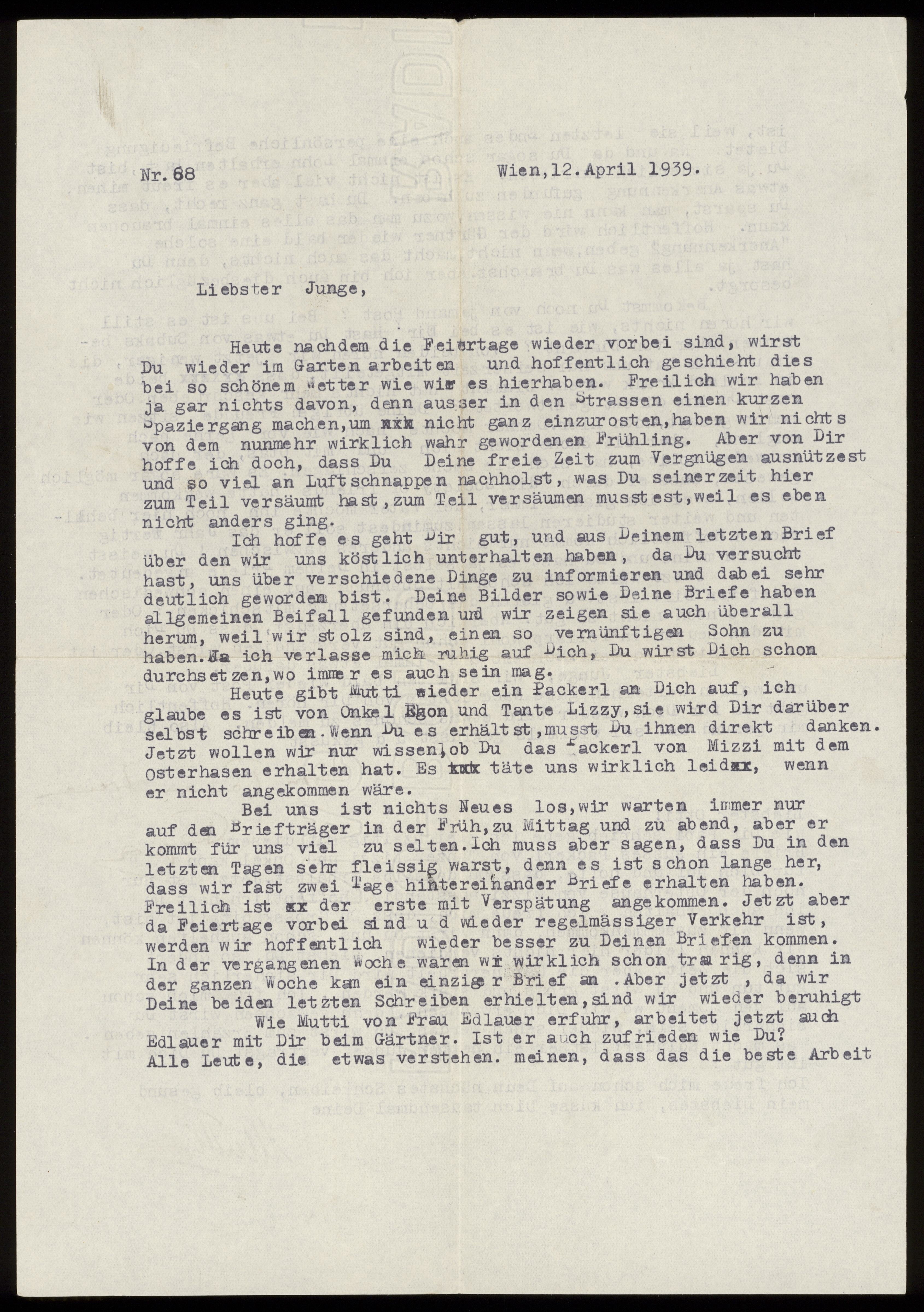 Maskinskrivet brev till Otto Ullman från föräldrarna Josef och Elise Ullmann daterat 12 april 1939 Wien.