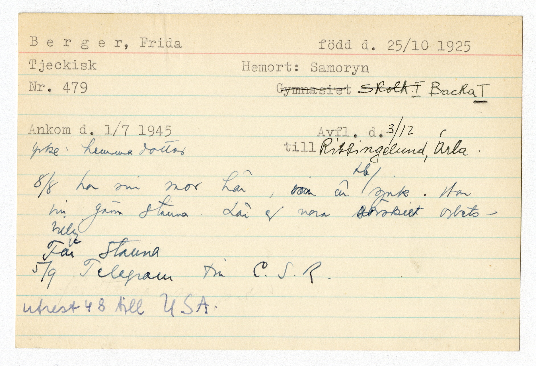 Ett skrivkort med patientuppgifter gällande Frida Berger.