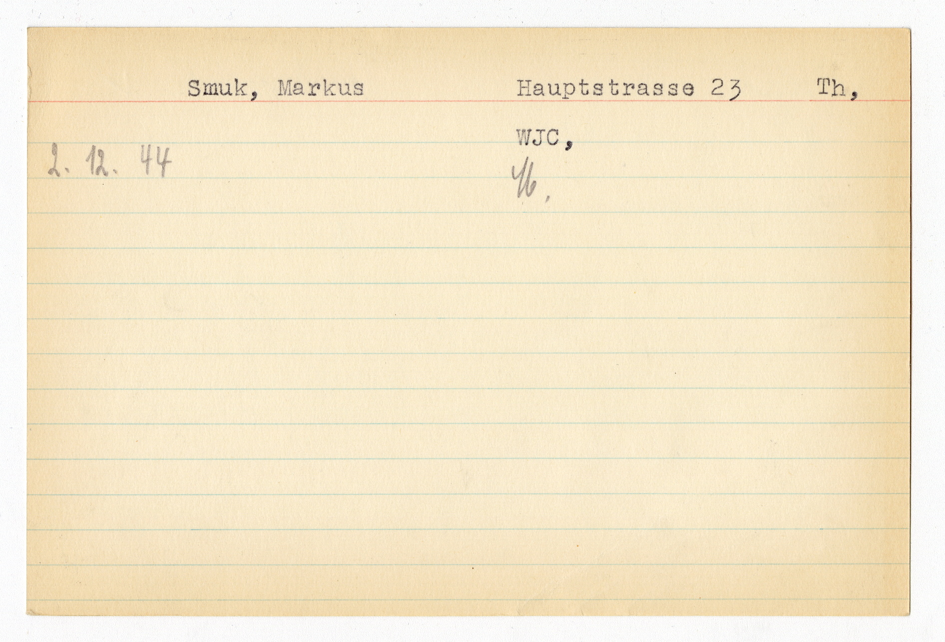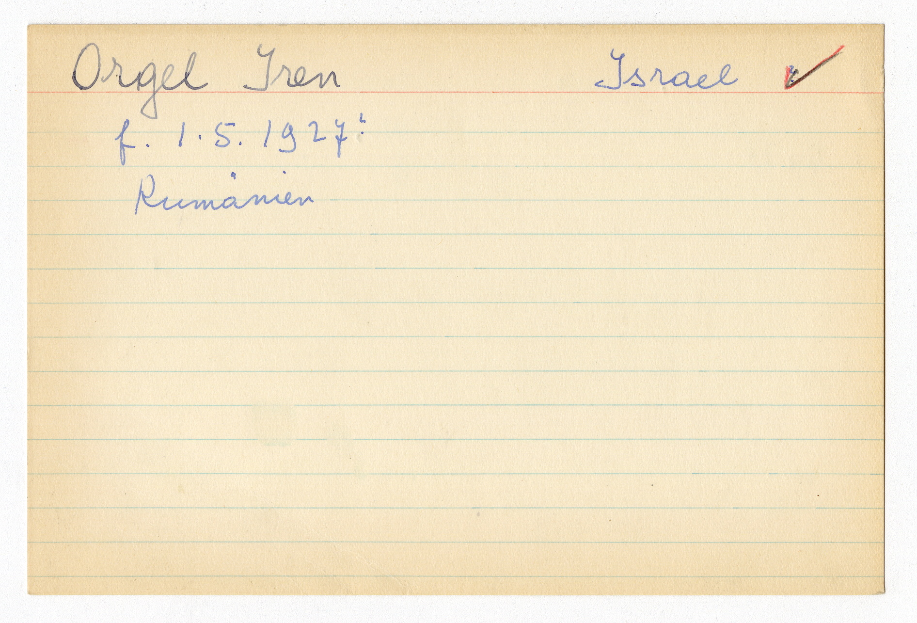 Ett skrivkort med patientuppgifter gällande Iren Orgel. På baksidan uppgifter om matpaket till Markus Smuk i Theresienstadt.