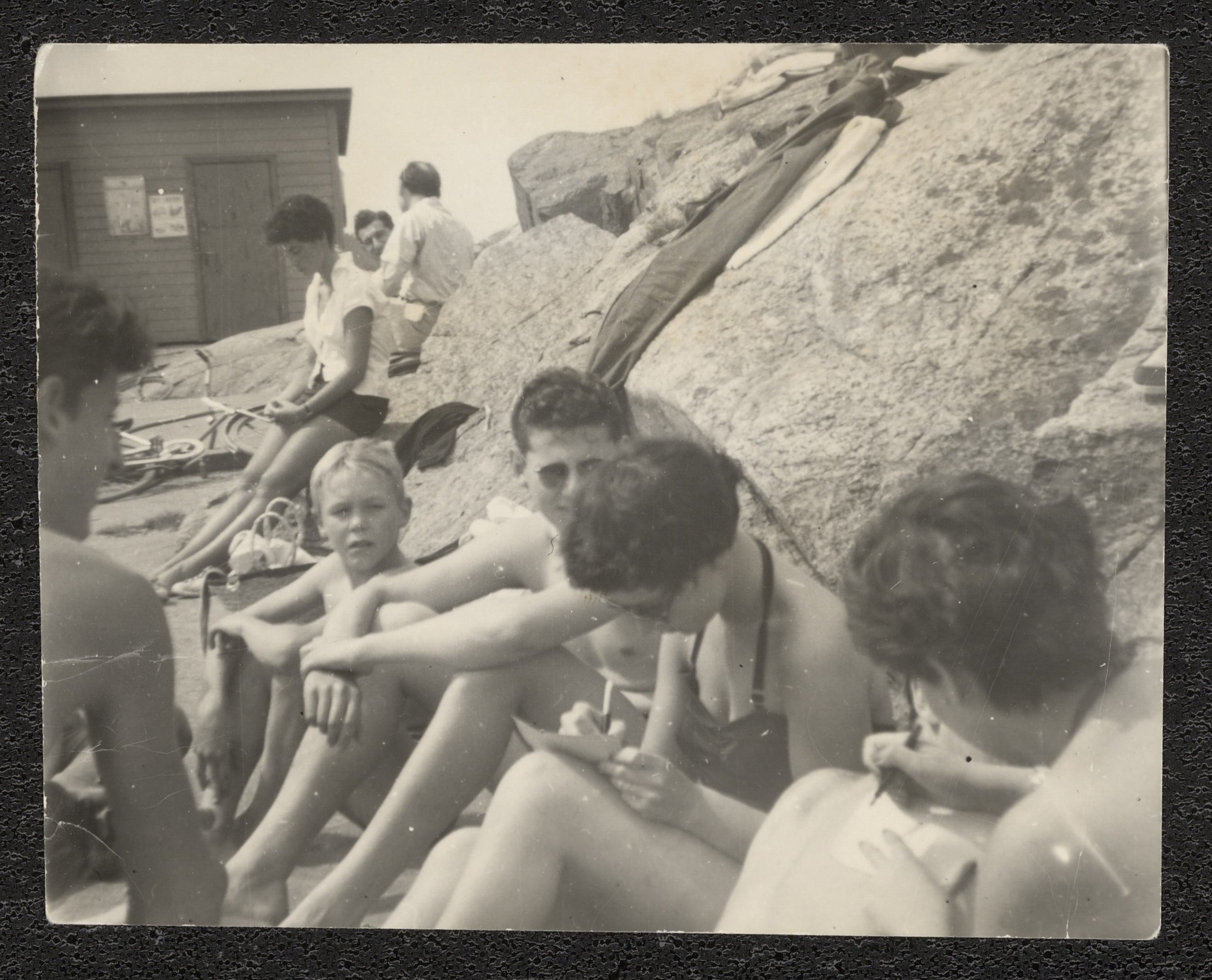 En samling ungdomar sitter invid en bergsknalle iförda badkläder. Ett par av dem verkar skriva brev. Bilden har tillhört Georg Witt och är troligen tagen vid en återträff i Uddevalla 1954.