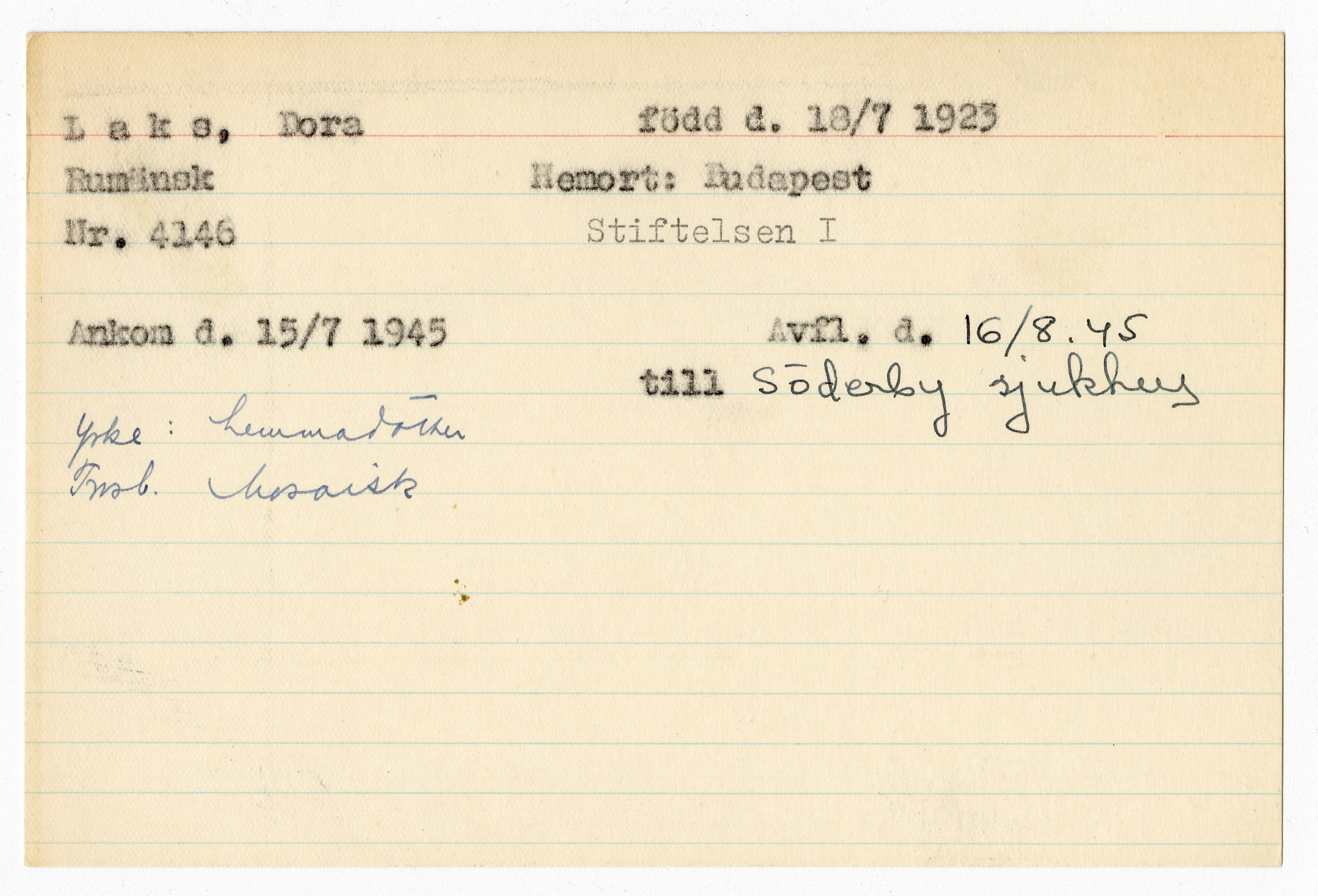 Ett skrivkort med patientuppgifter gällande Dora Laks.