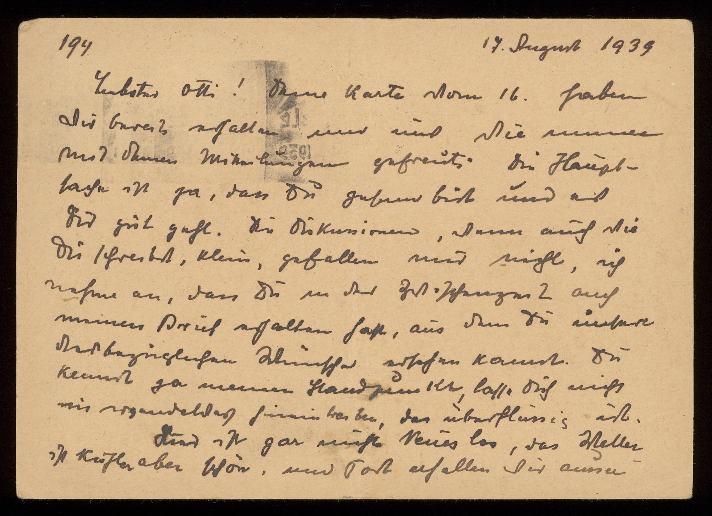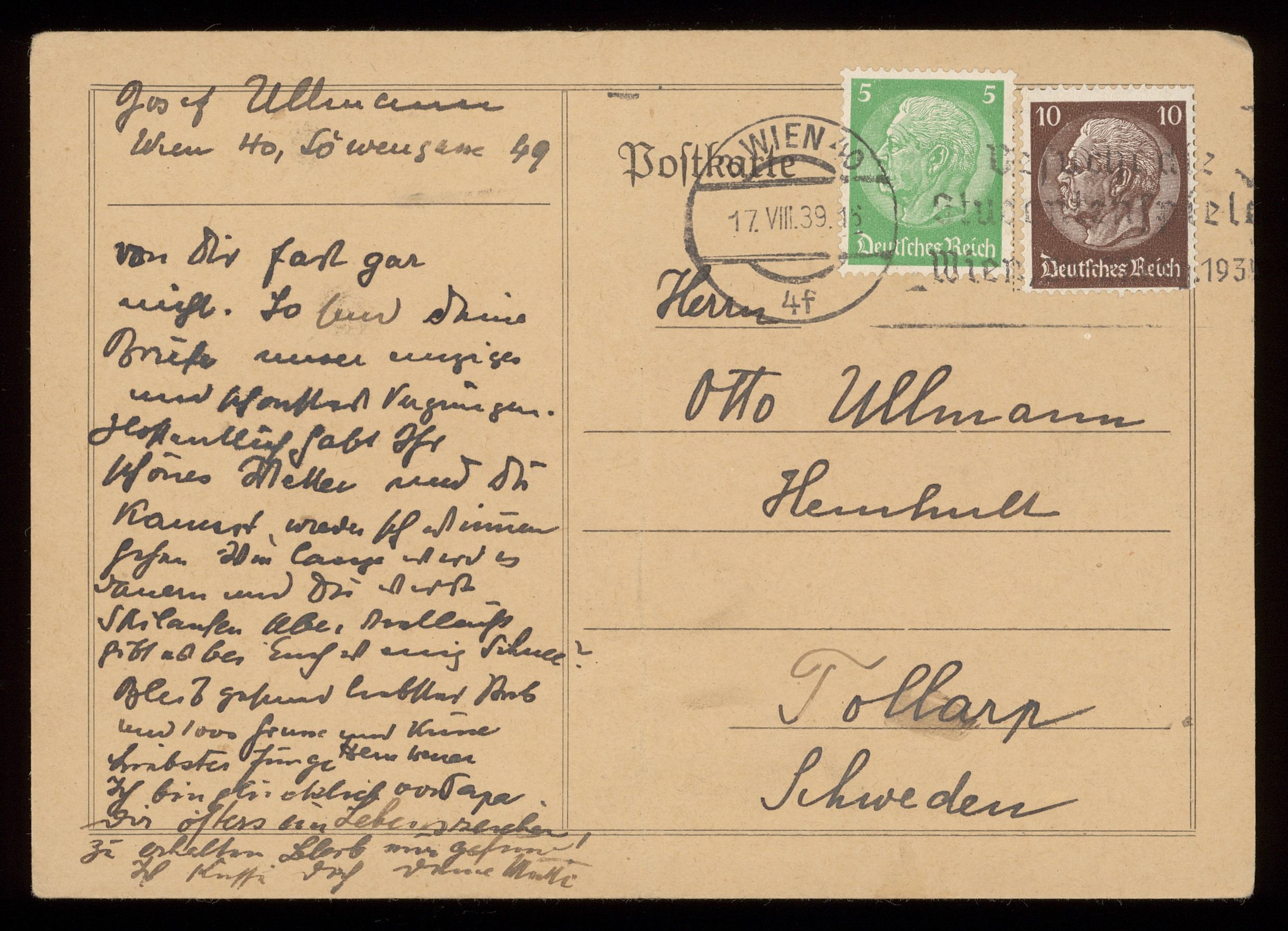 Brev till Otto Ullman från föräldrarna Josef och Elise Ullmann daterat 17 augusti 1939 Wien.