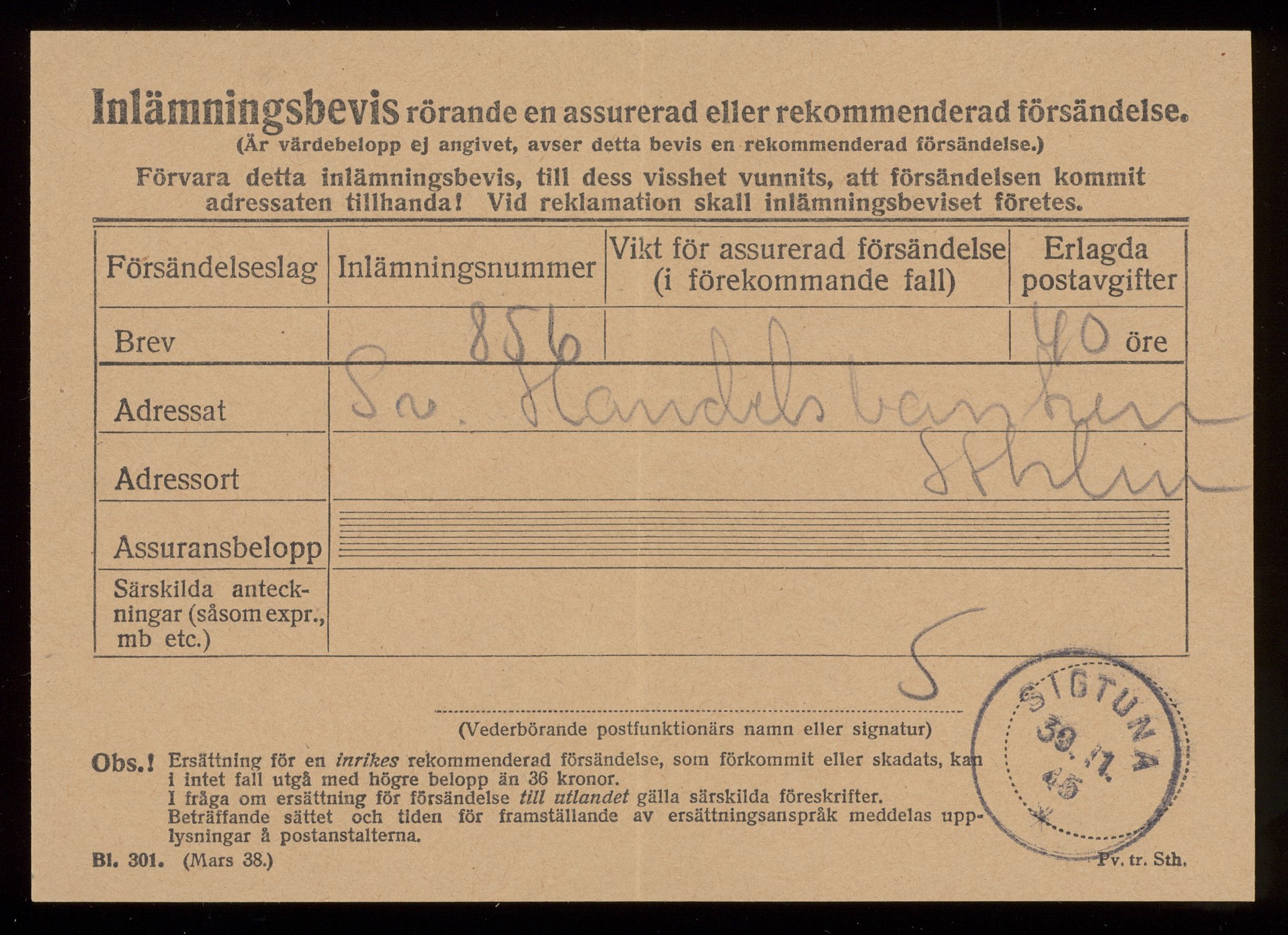 Ett inlämningsbevis från Delly Wind adresserat till Handelsbanken i Stockholm 30 november 1945 Sigtuna.