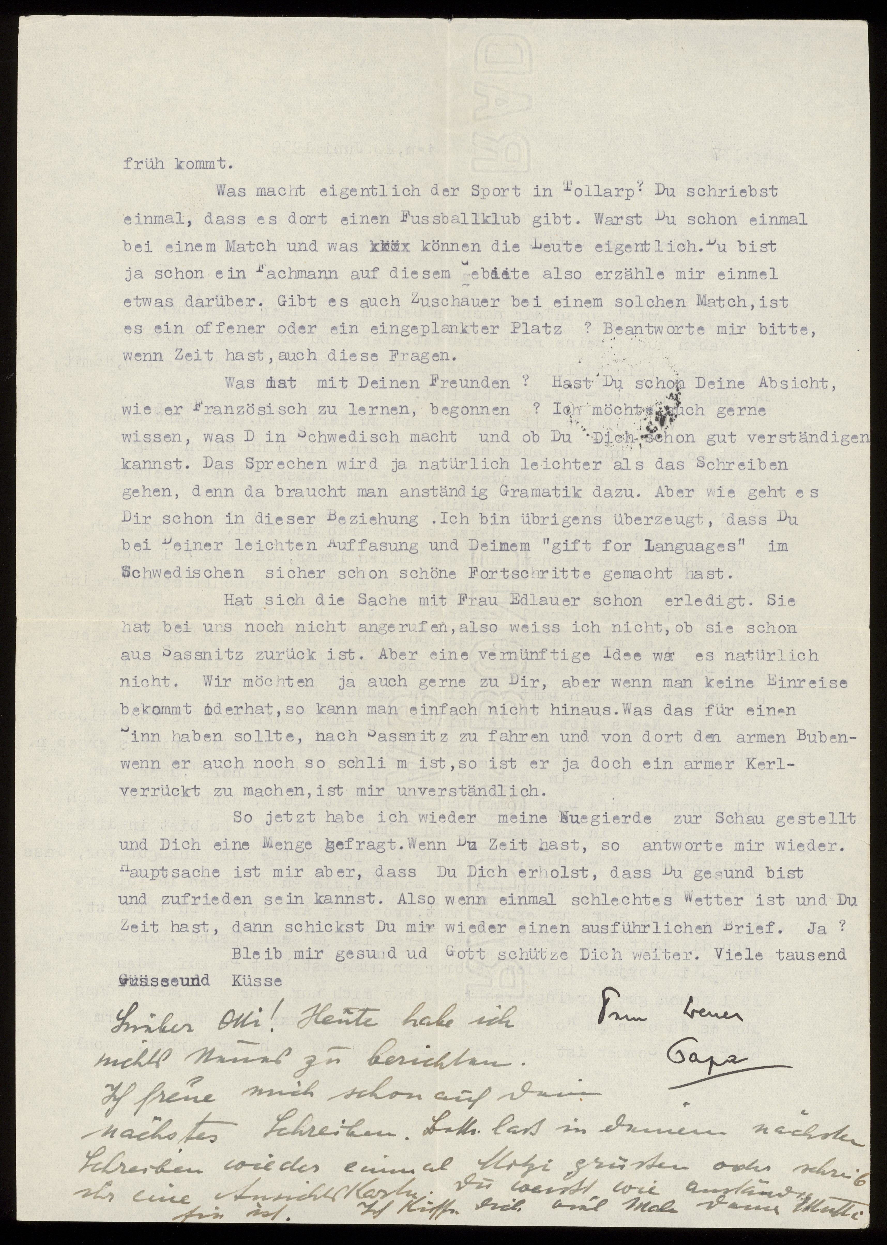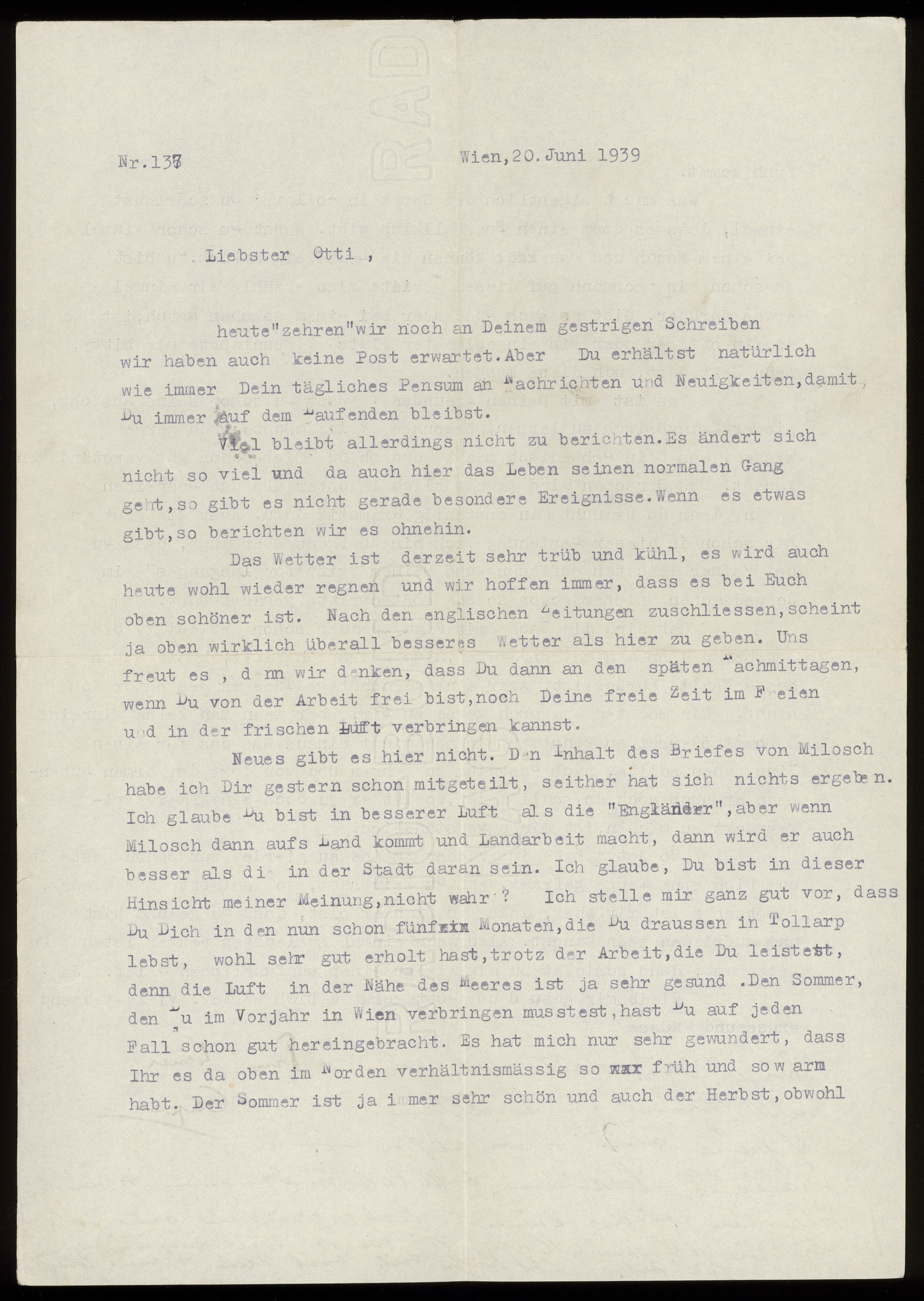 Maskinskrivet brev till Otto Ullman från föräldrarna Josef och Elise Ullmann daterat 20 juni 1939 Wien.