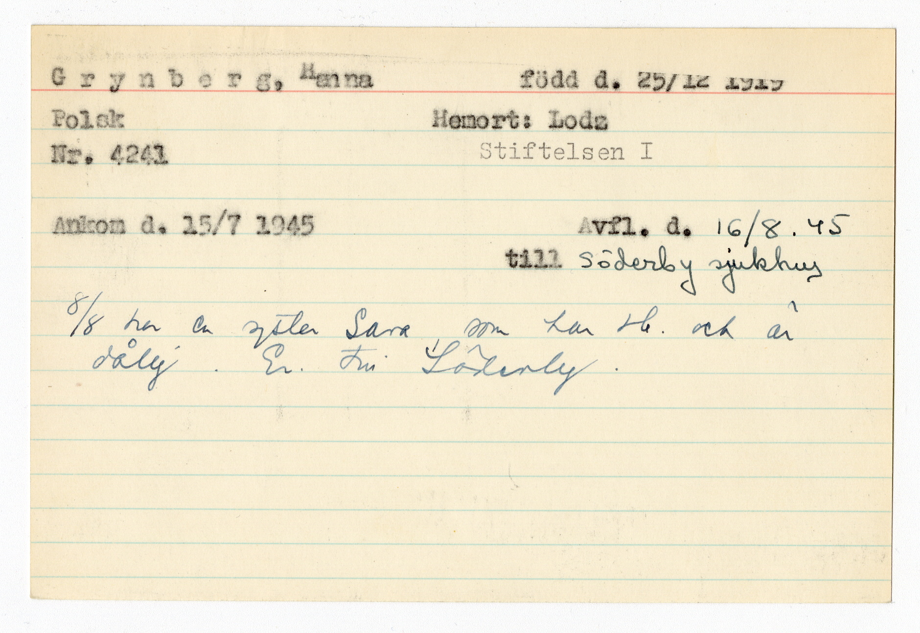 Ett skrivkort med patientuppgifter gällande Hanna Grynberg.