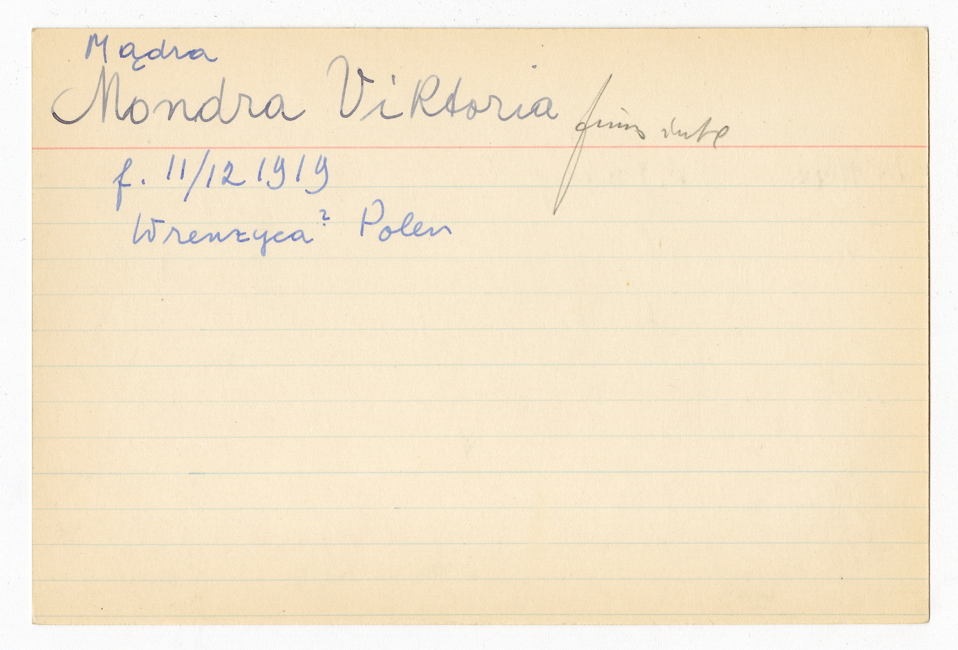 Ett skrivkort med patientuppgifter gällande Viktoria Madra. På baksidan uppgifter om matpaket till Eleonore Schalek i Theresienstadt.