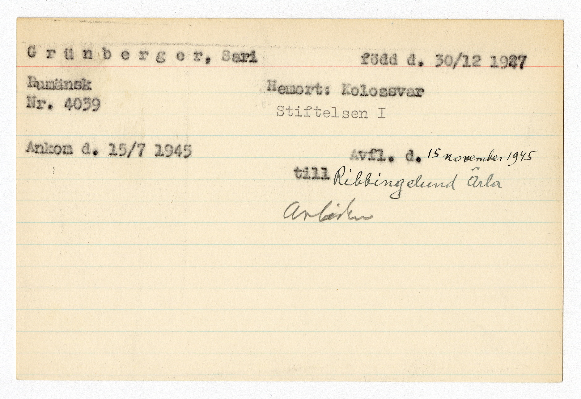Ett skrivkort med patientuppgifter gällande Sari Grünberger.