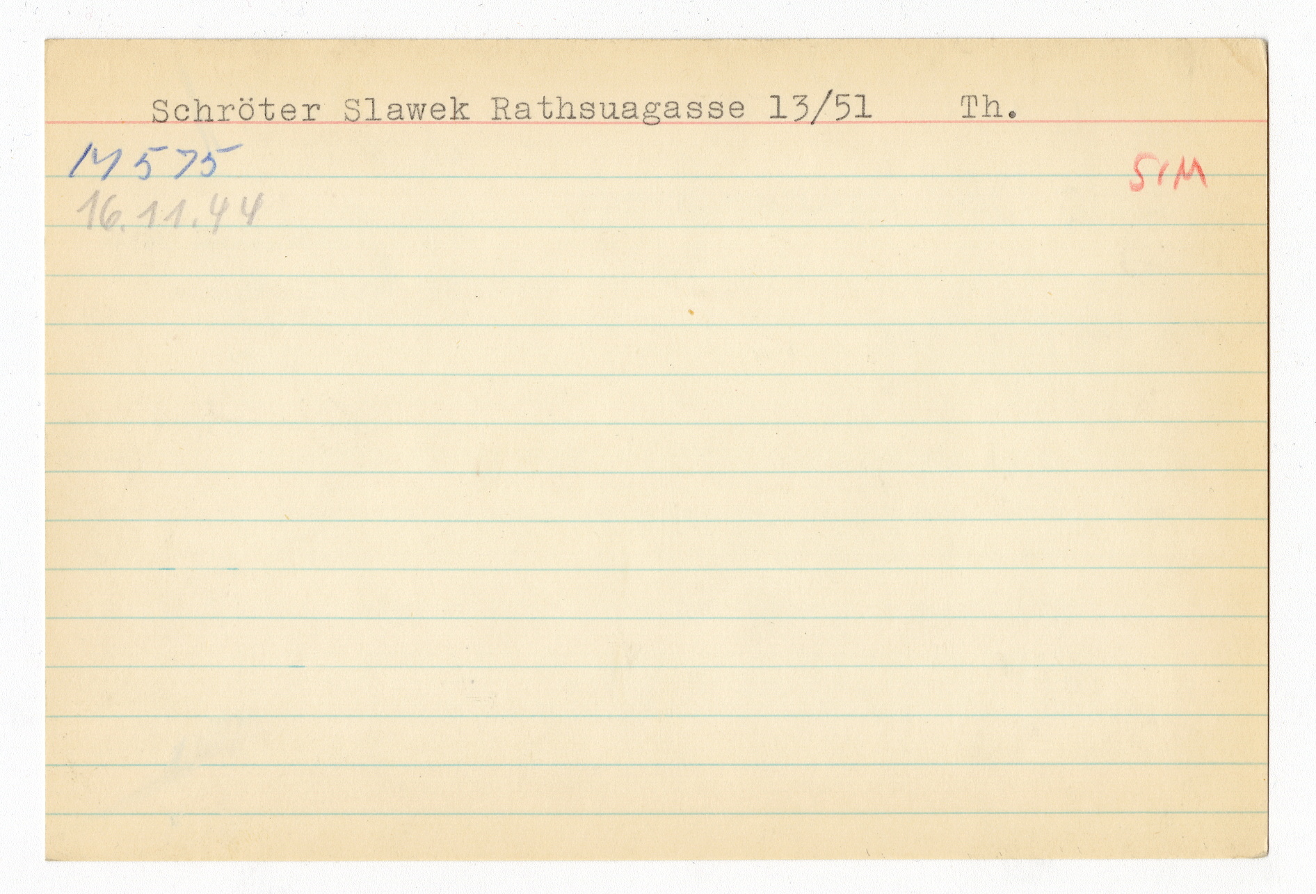 Ett skrivkort med patientuppgifter gällande Rosa Parasol. På baksidan uppgifter om matpaket till Slawek Schröter i Theresienstadt.