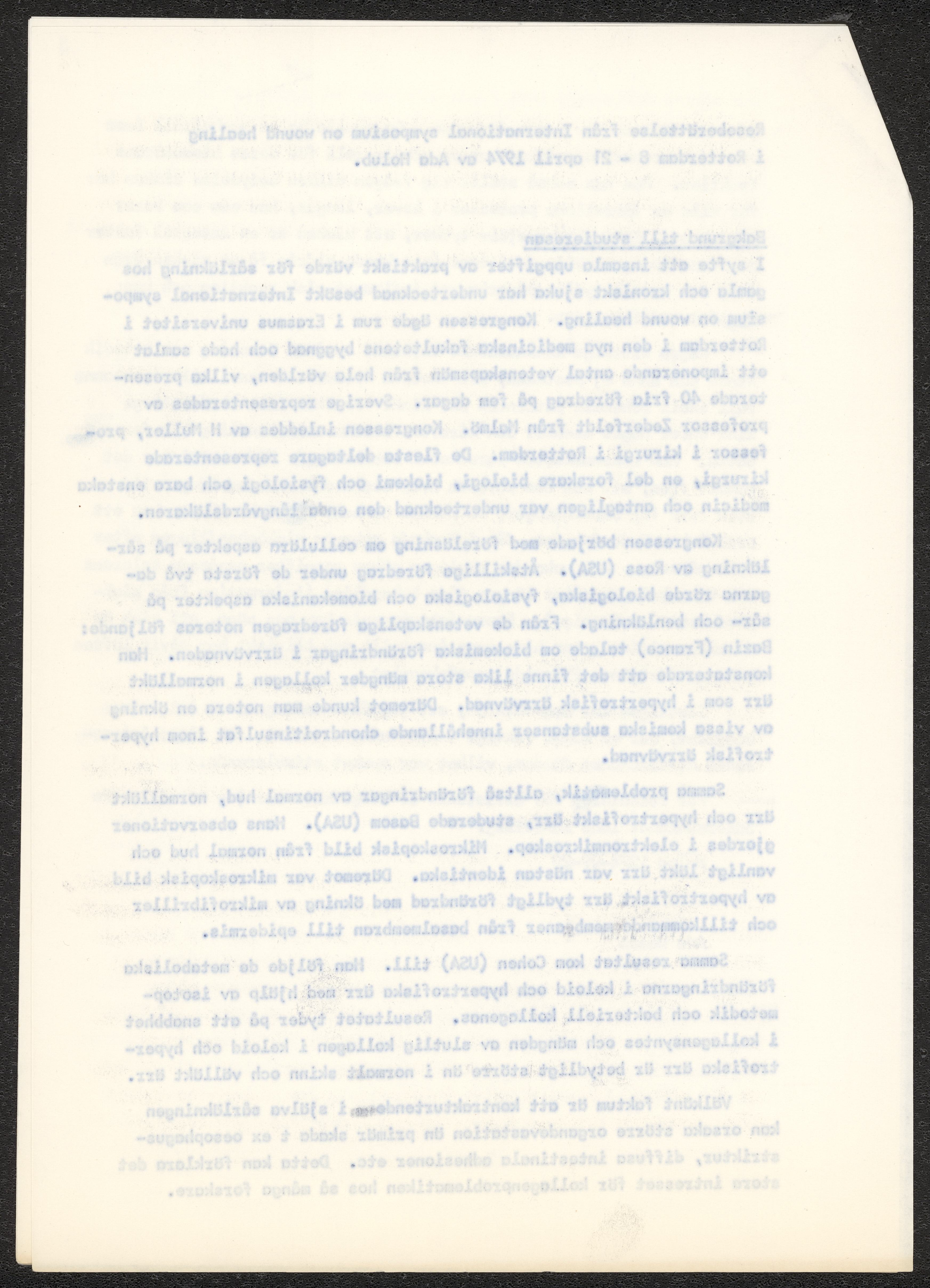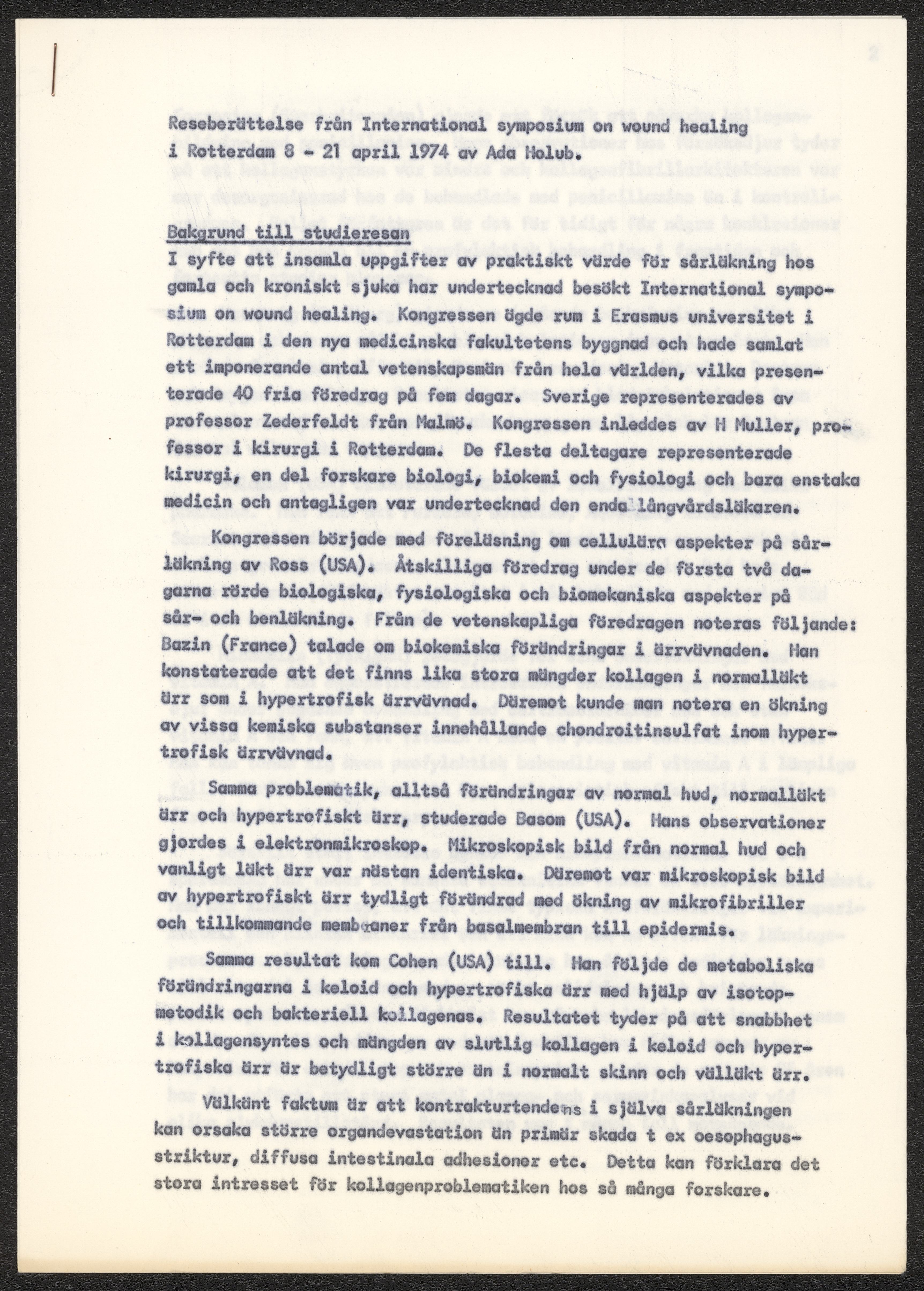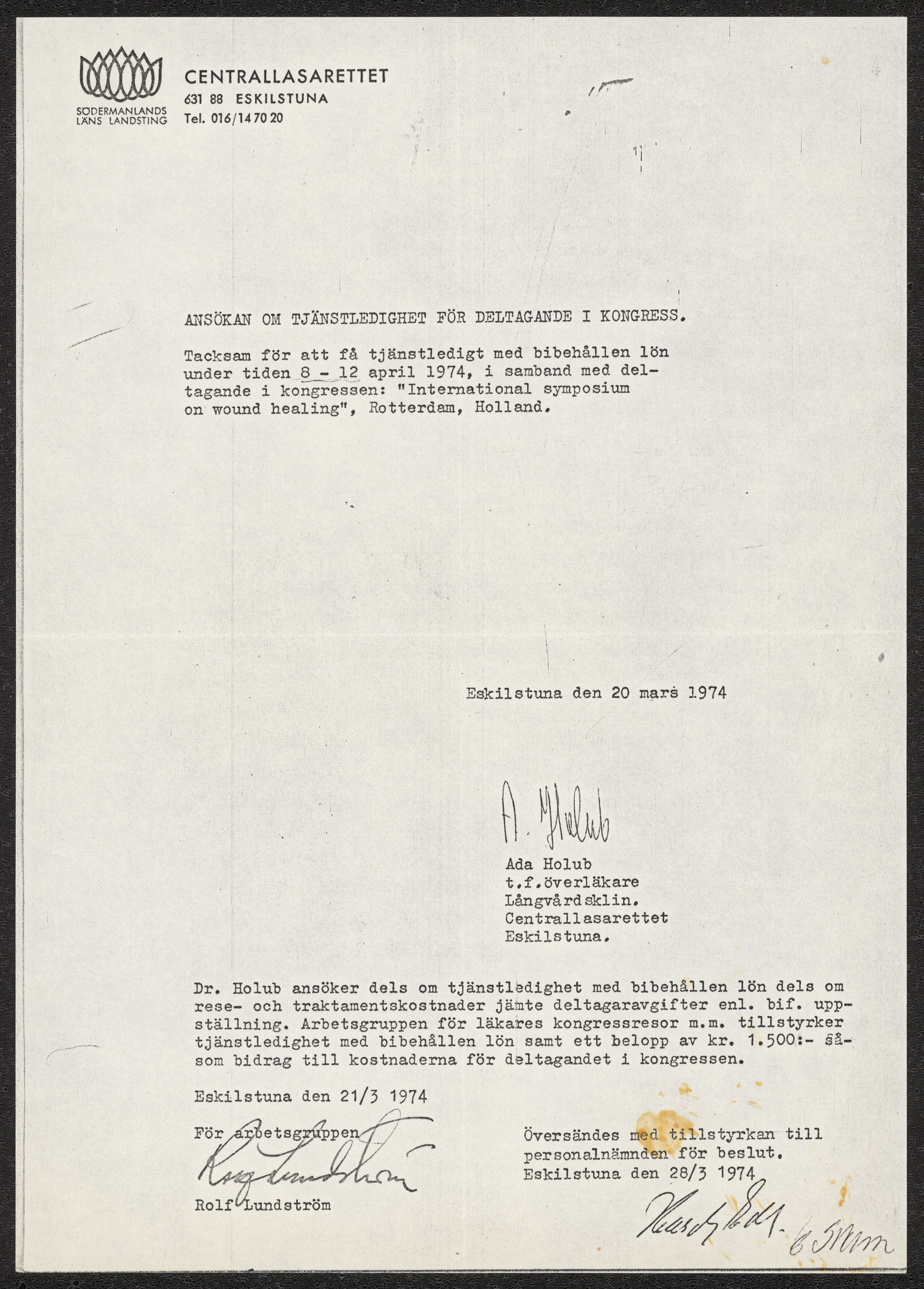 Ansökan om ledighet för deltagande i kongressen "International symposium on wound healing", skriven av Ada Holub 1974. Samt reseberättelse från aktuell kongress.