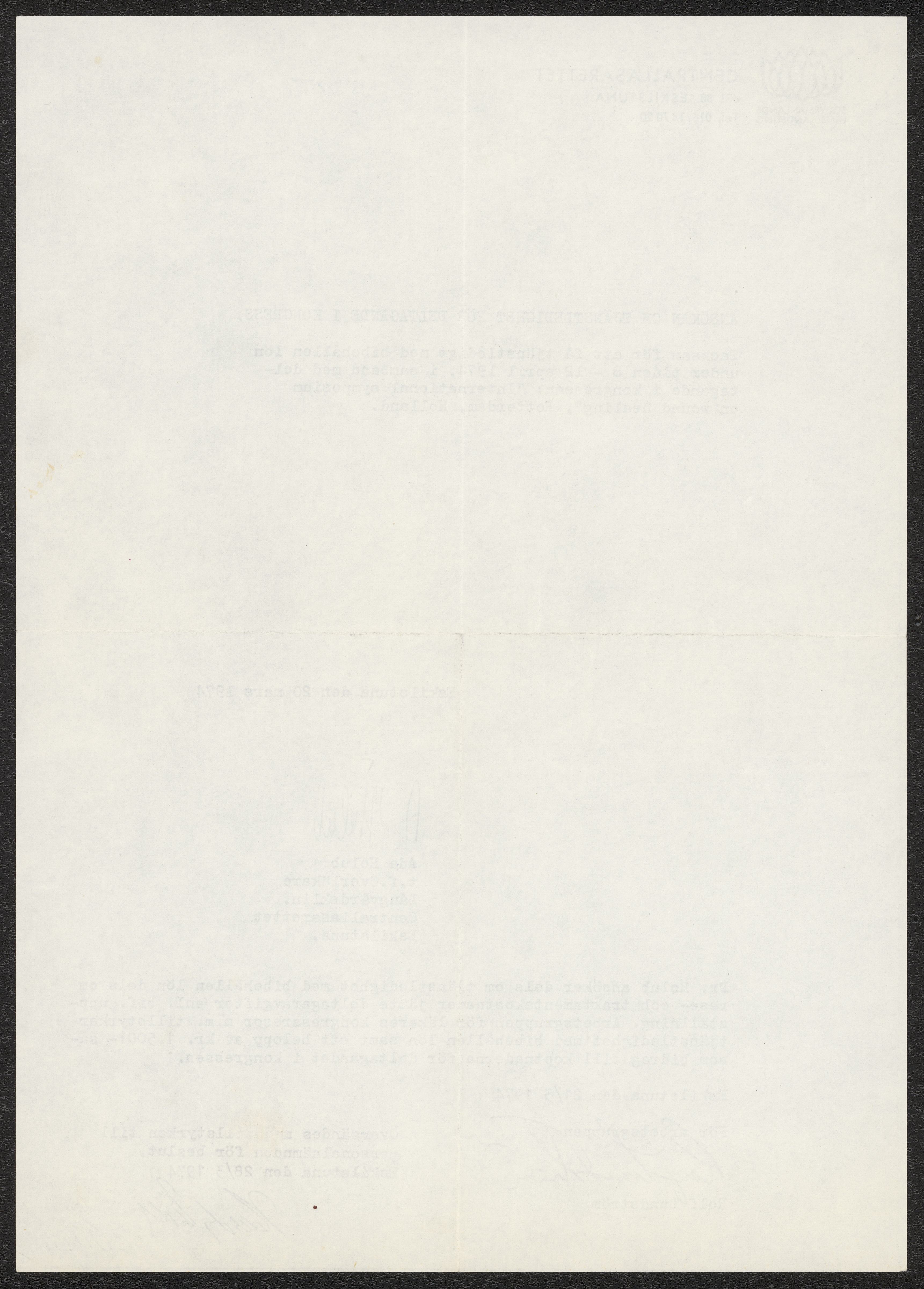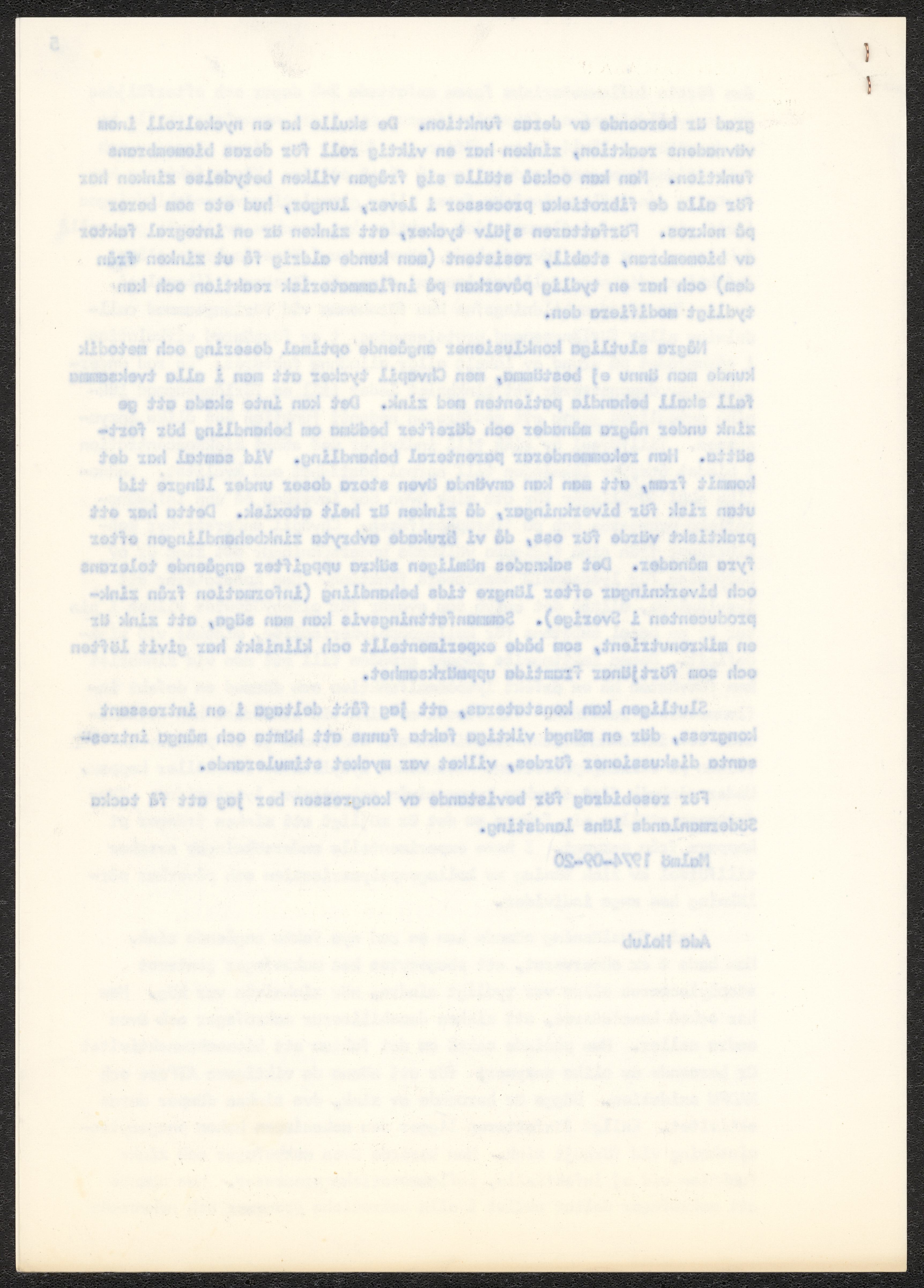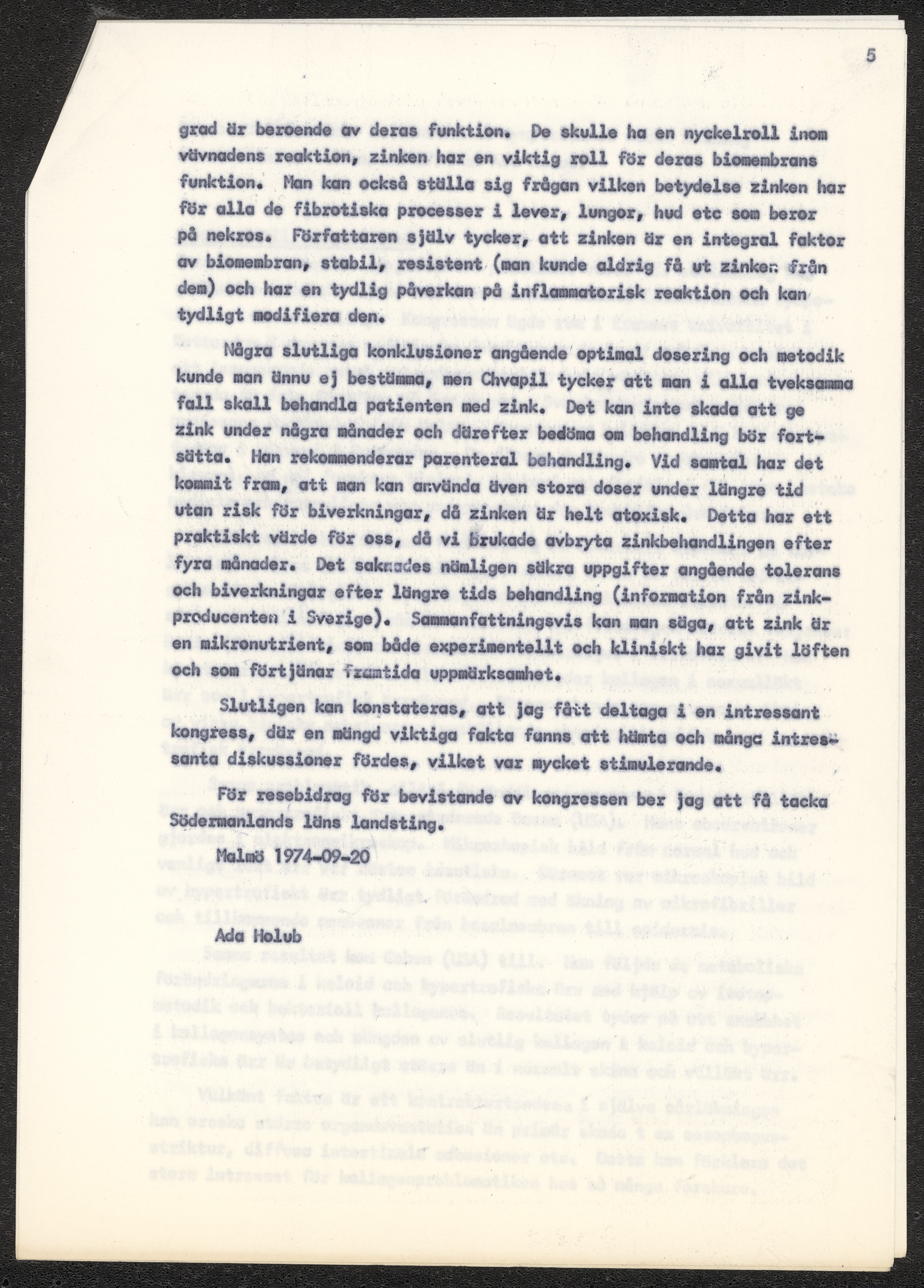 Ansökan om ledighet för deltagande i kongressen "International symposium on wound healing", skriven av Ada Holub 1974. Samt reseberättelse från aktuell kongress.