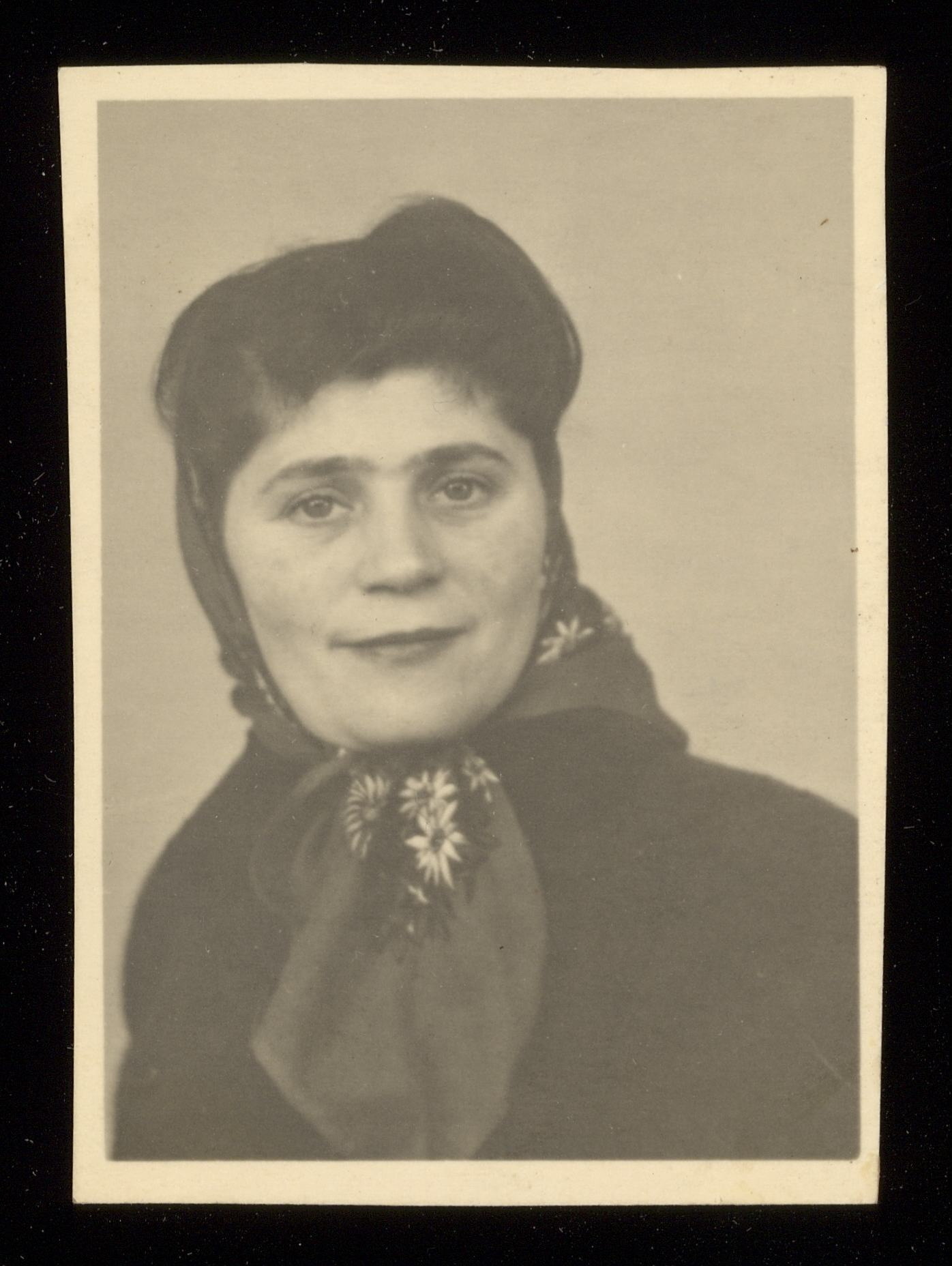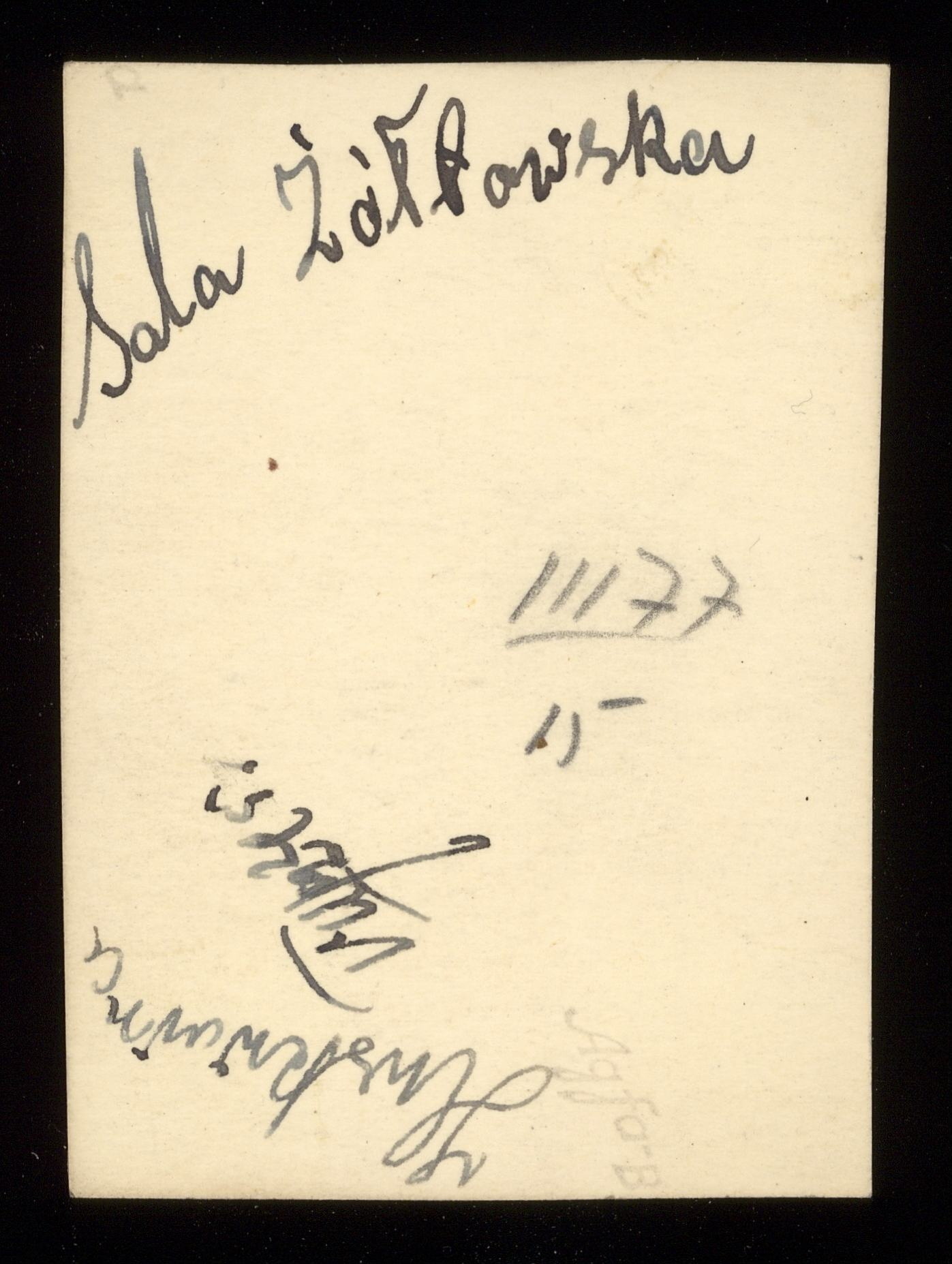 Svartvit porträttfotografi av Sala Zoltowska (senare Sara Säll), taget i Huskvarna 1945. På baksidan finns texten: Sala Zoltowska Huskvarna.