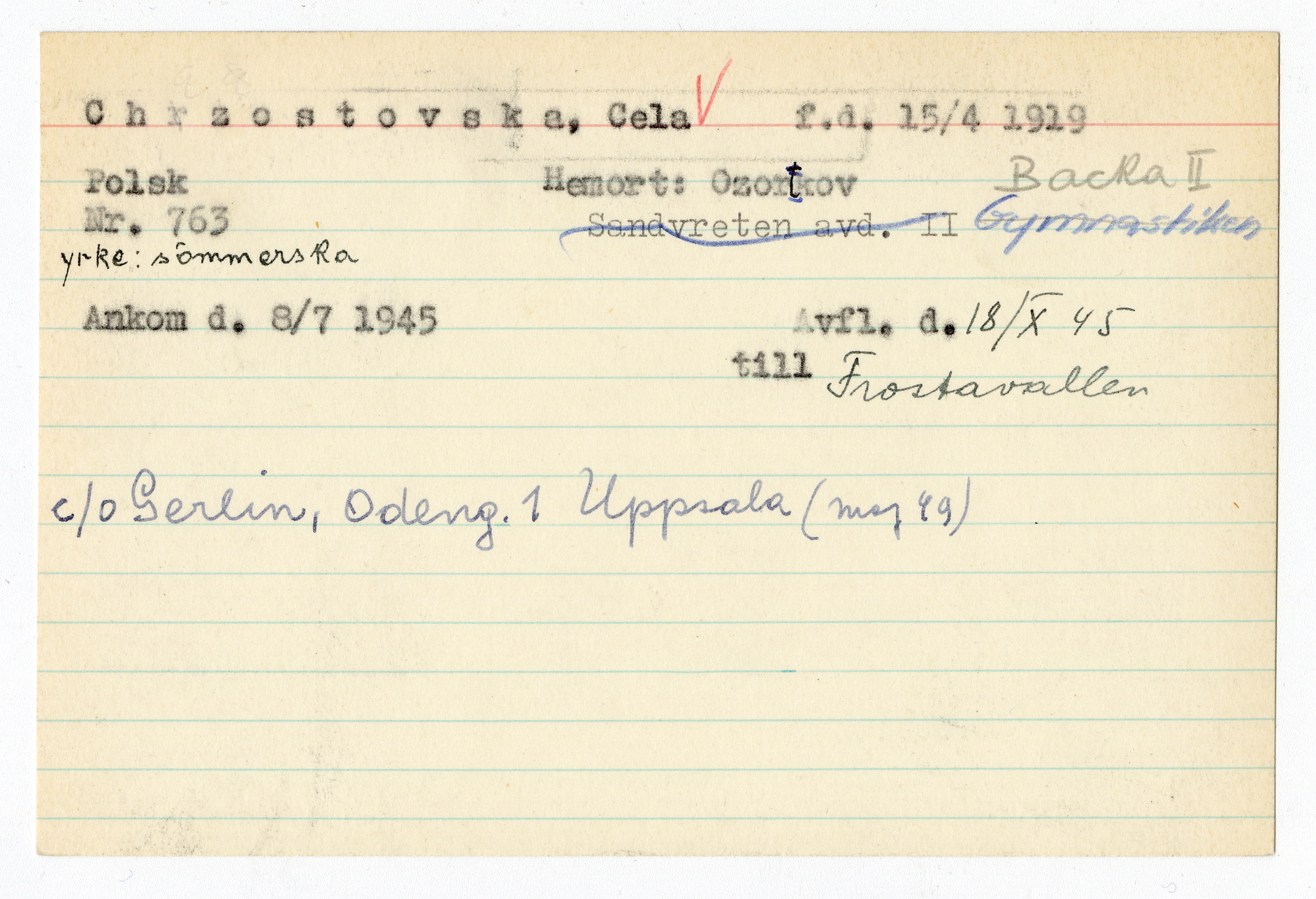 Ett skrivkort med patientuppgifter gällande Cela Chzostovska.