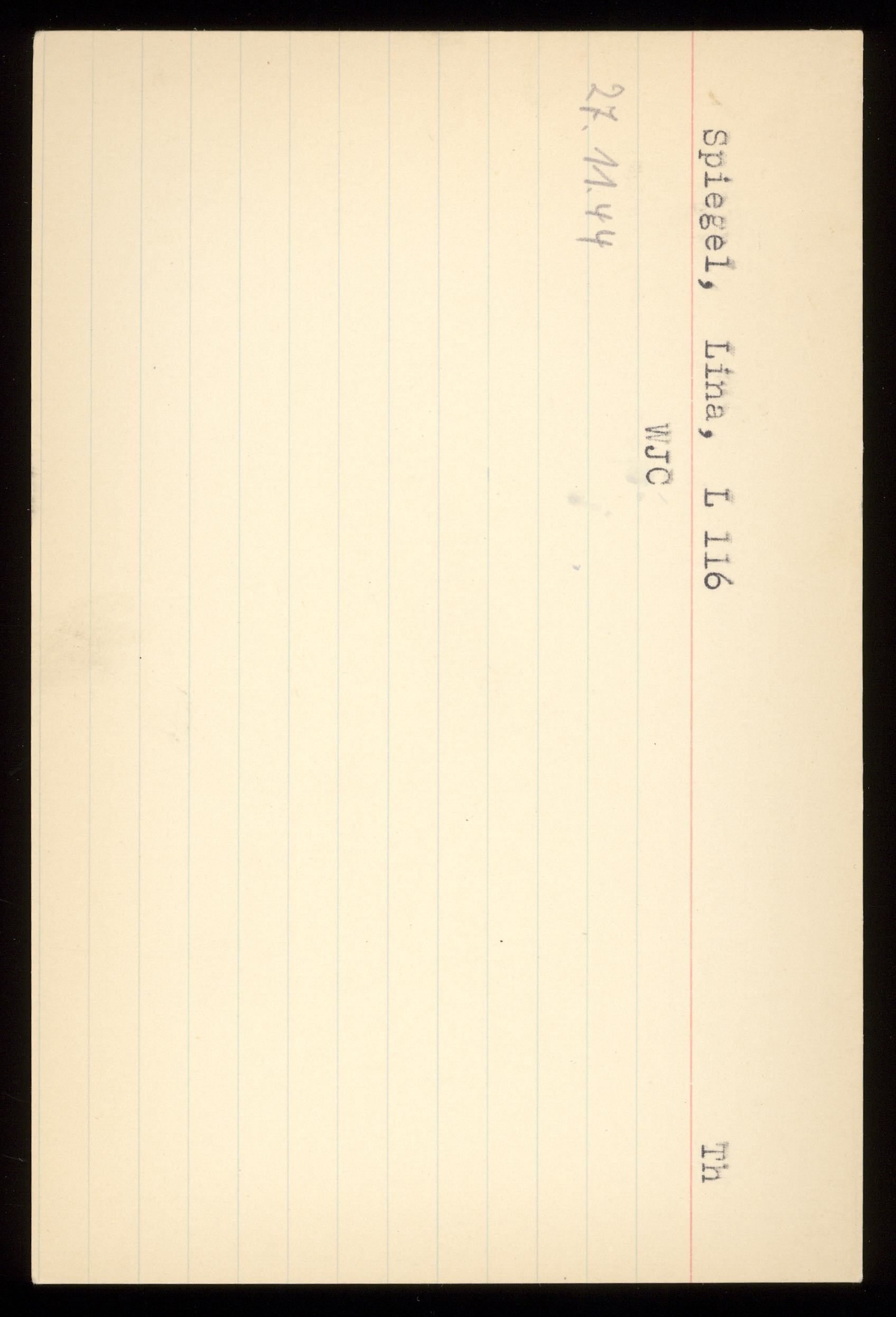 Ett skrivkort med patientuppgifter gällande Klara Szilagyi. På baksidan uppgifter om matpaket till Lina Spiegel i Theresienstadt.