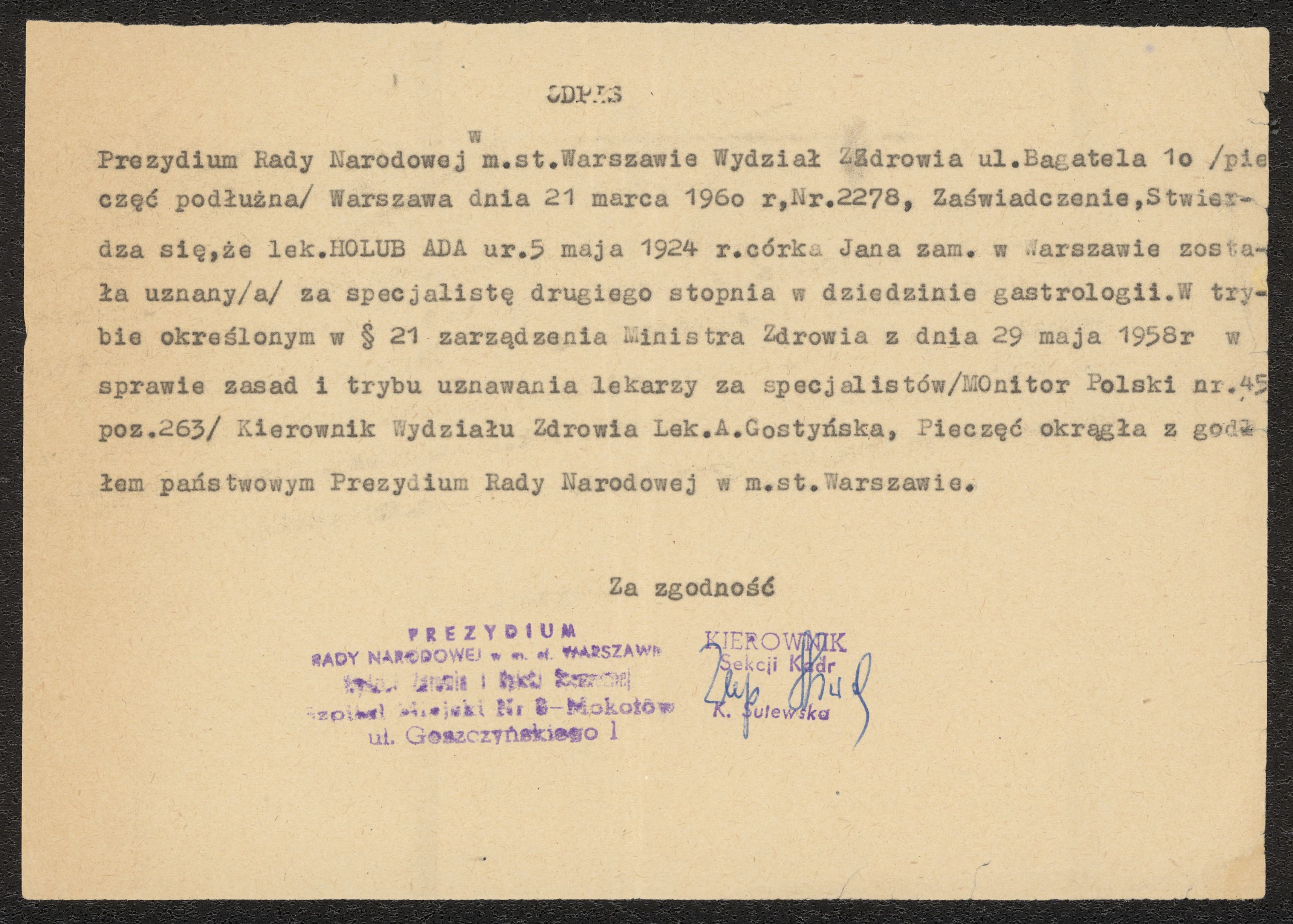 Intyg gällande specialistläkarkompetens inom gastrologi för Ada Hollubutfärdat 21 mars 1960.