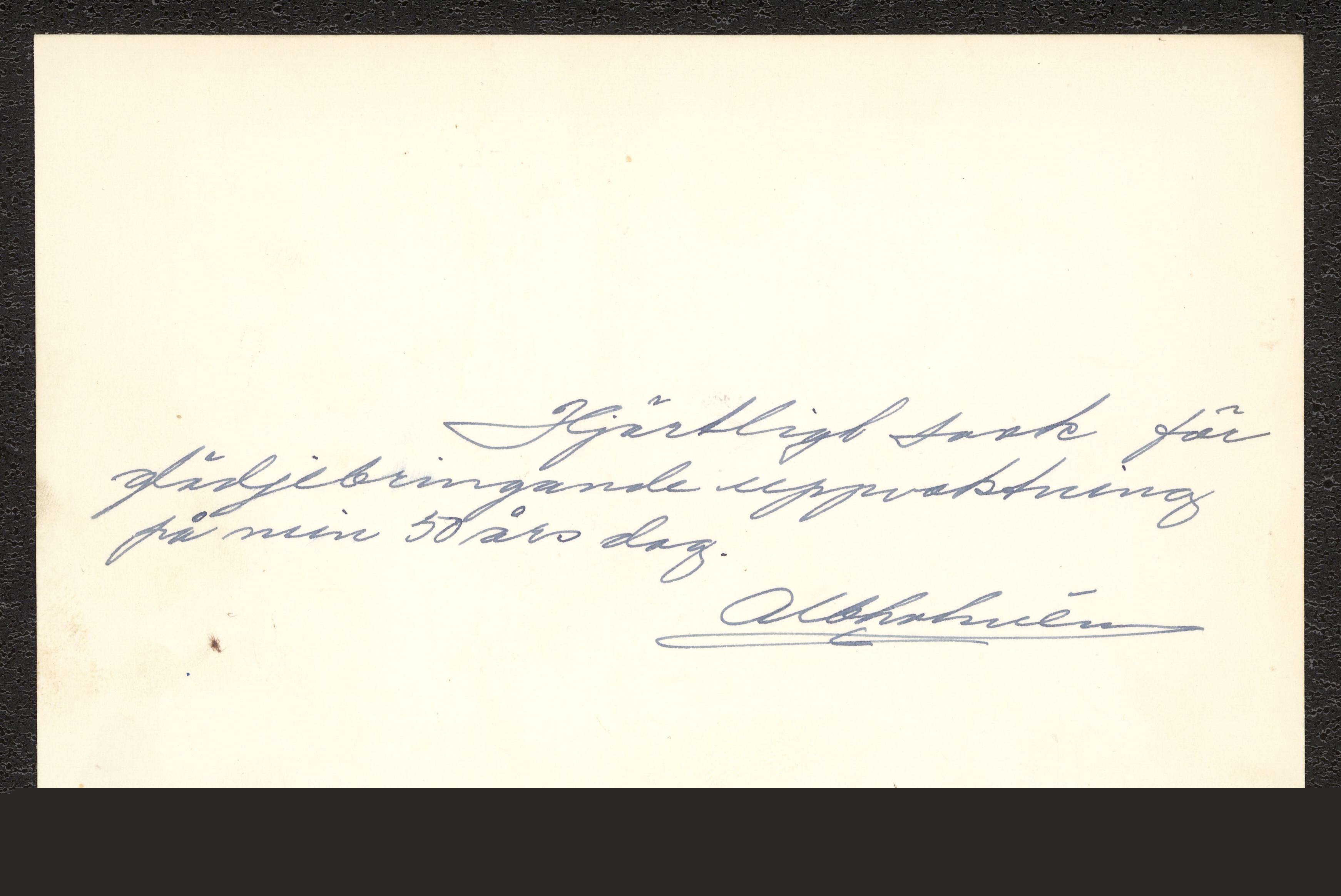 Rosa Gustafssons väninna Elsa Nordvall fyller jämt. Elsa bodde i övervåningen på Stensholmsvägen 4, där Rosa bodde första tiden i Sverige. De blev mycket goda vänner. På baksidan finns texten: "Hjärtligt tack för glädjebringande uppvaktning på min 50 års dag. Al********én".