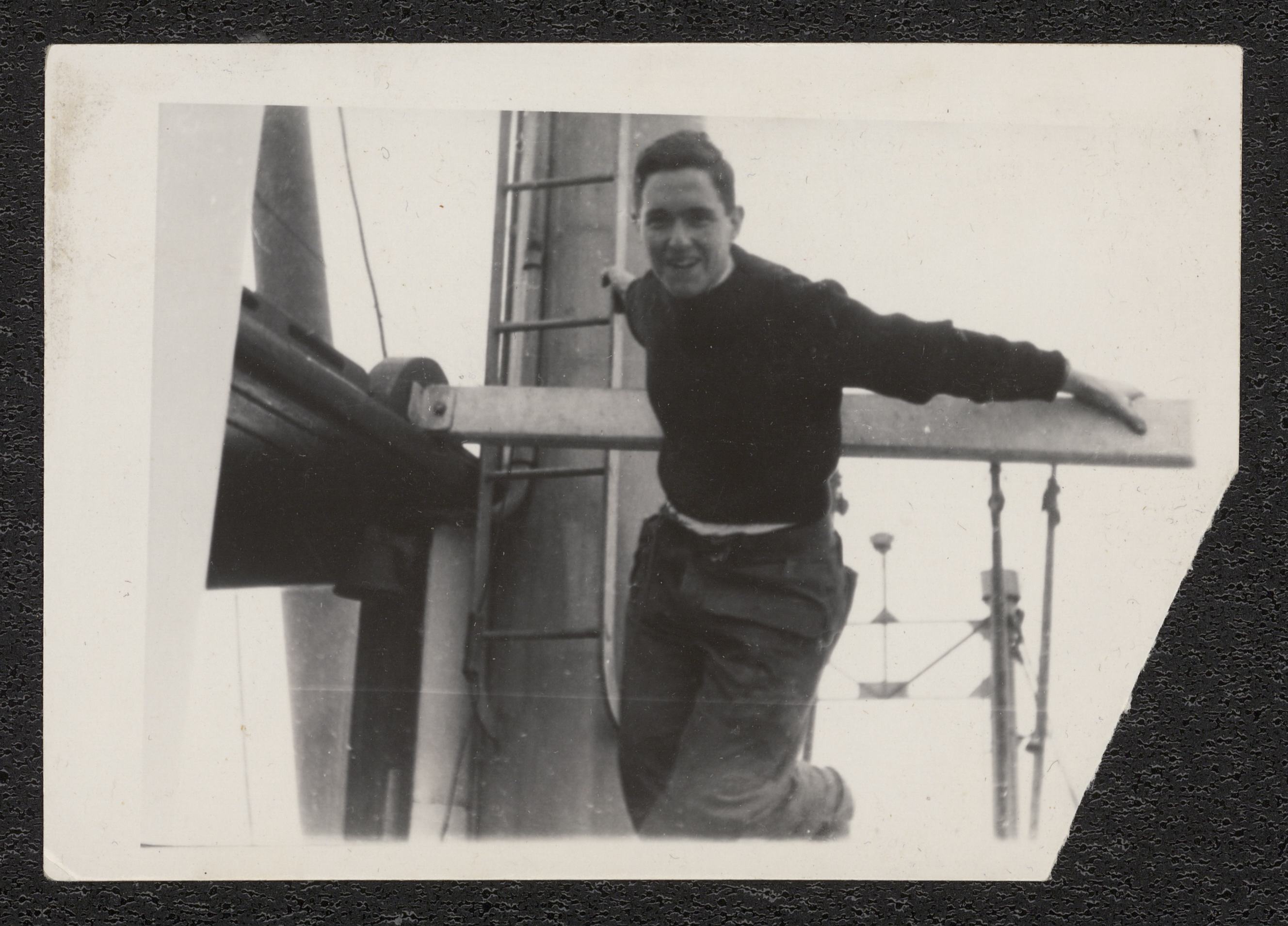 En ung Georg Witt ler mot kameran. Han förefaller att stå på ett fartygsdäck eller liknande miljö, och håller sig i en lejdare.
