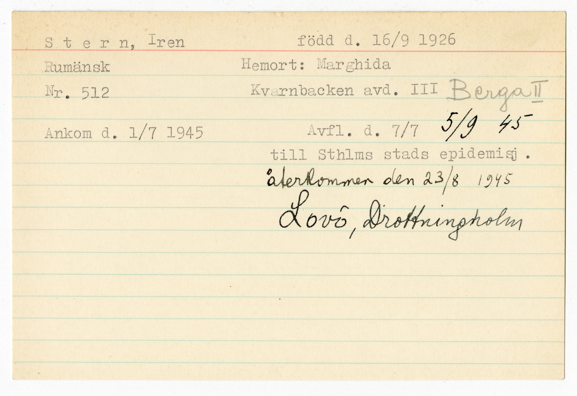 Ett skrivkort med patientuppgifter gällande Iren Stern.