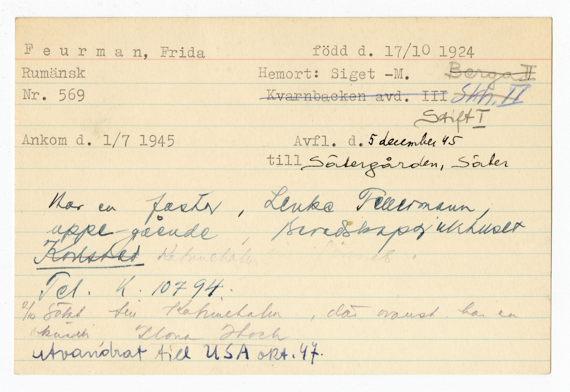 Ett skrivkort med patientuppgifter gällande Frida Feurman.