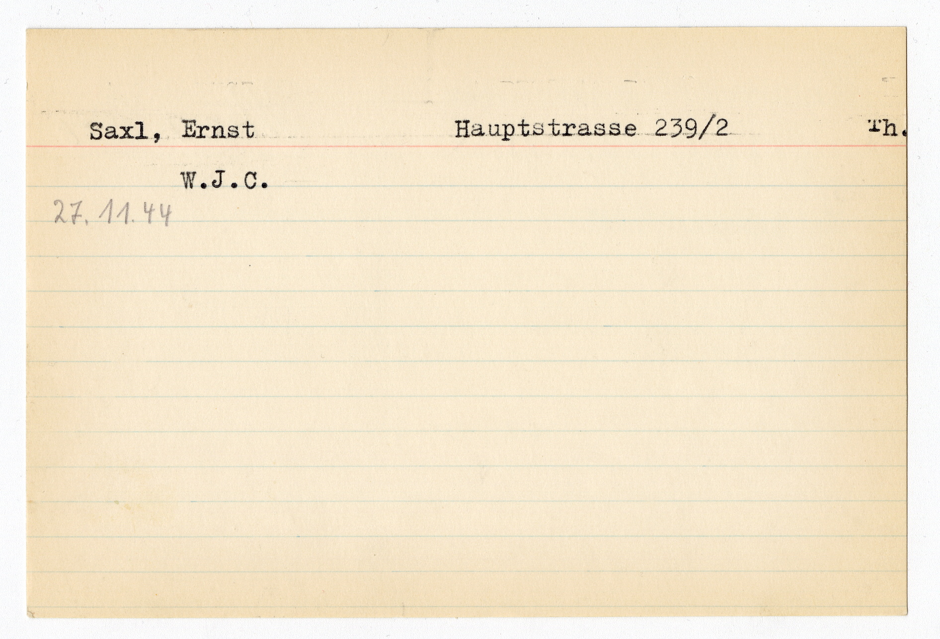 Ett skrivkort med patientuppgifter gällande Klara Klein. På baksidan uppgifter om matpaket till Ernst Saxl i Theresienstadt.