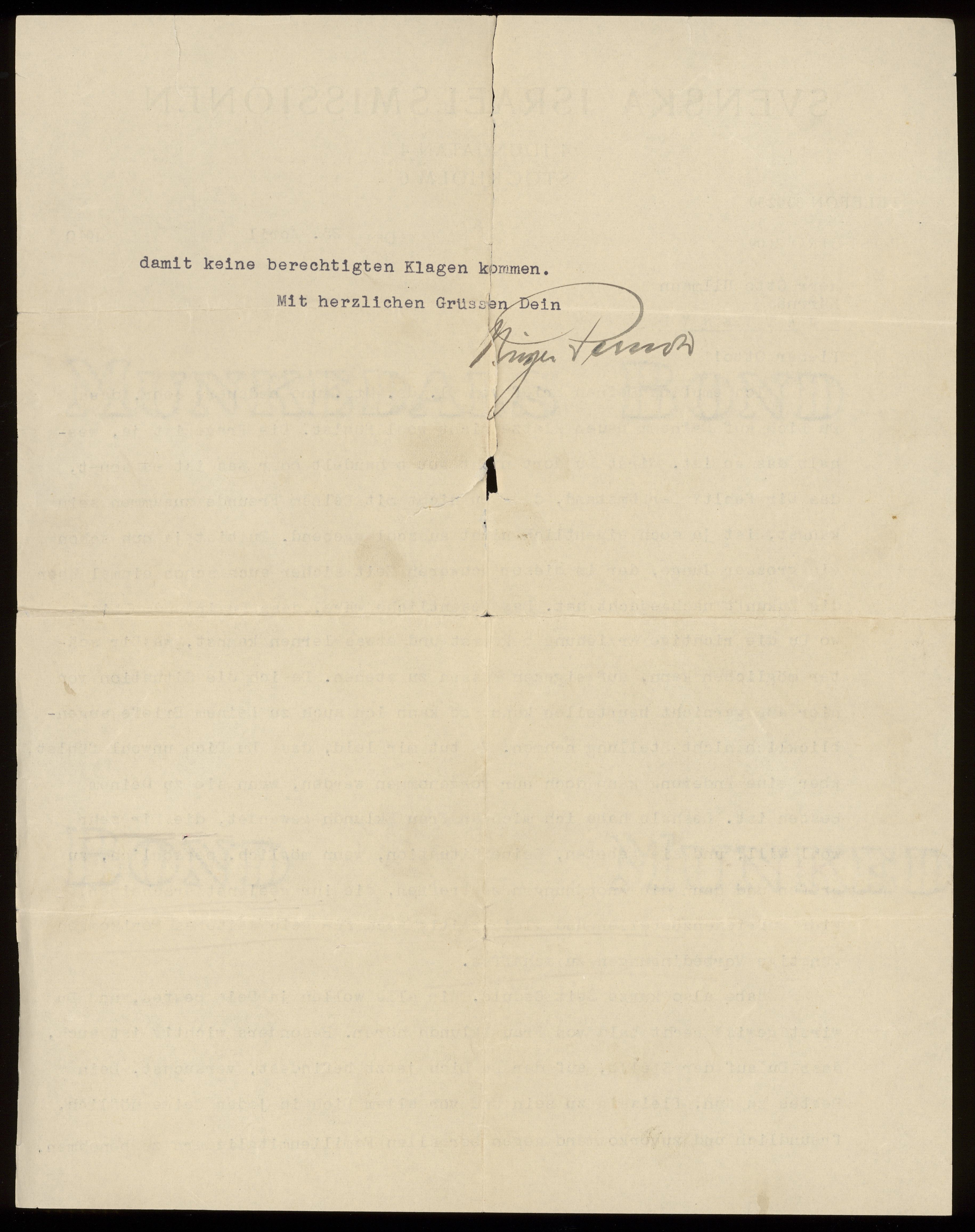 Officiellt brev från Svenska Israelkommissionen 25 april 1940 Stockholm.