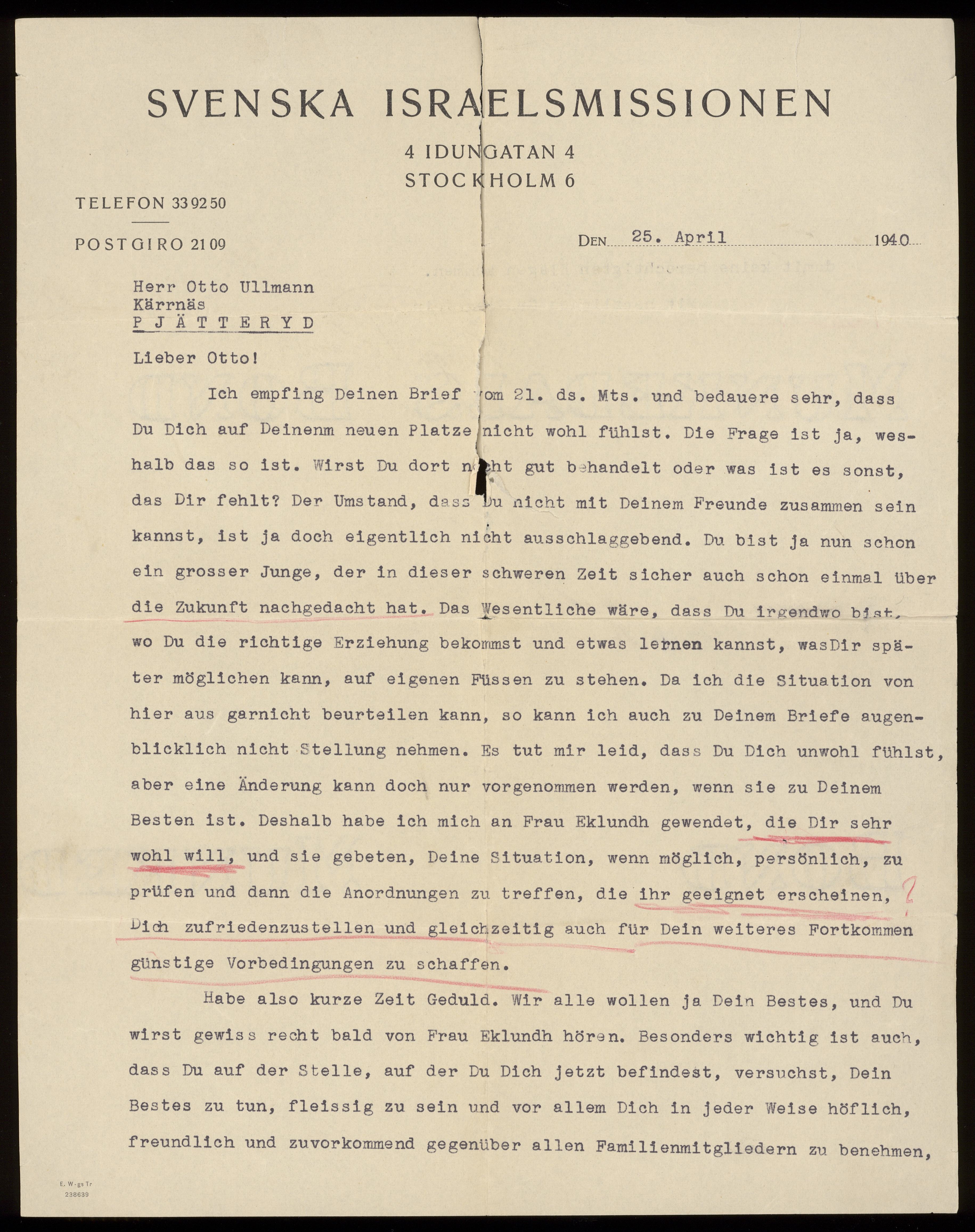 Officiellt brev från Svenska Israelkommissionen 1940-04-25