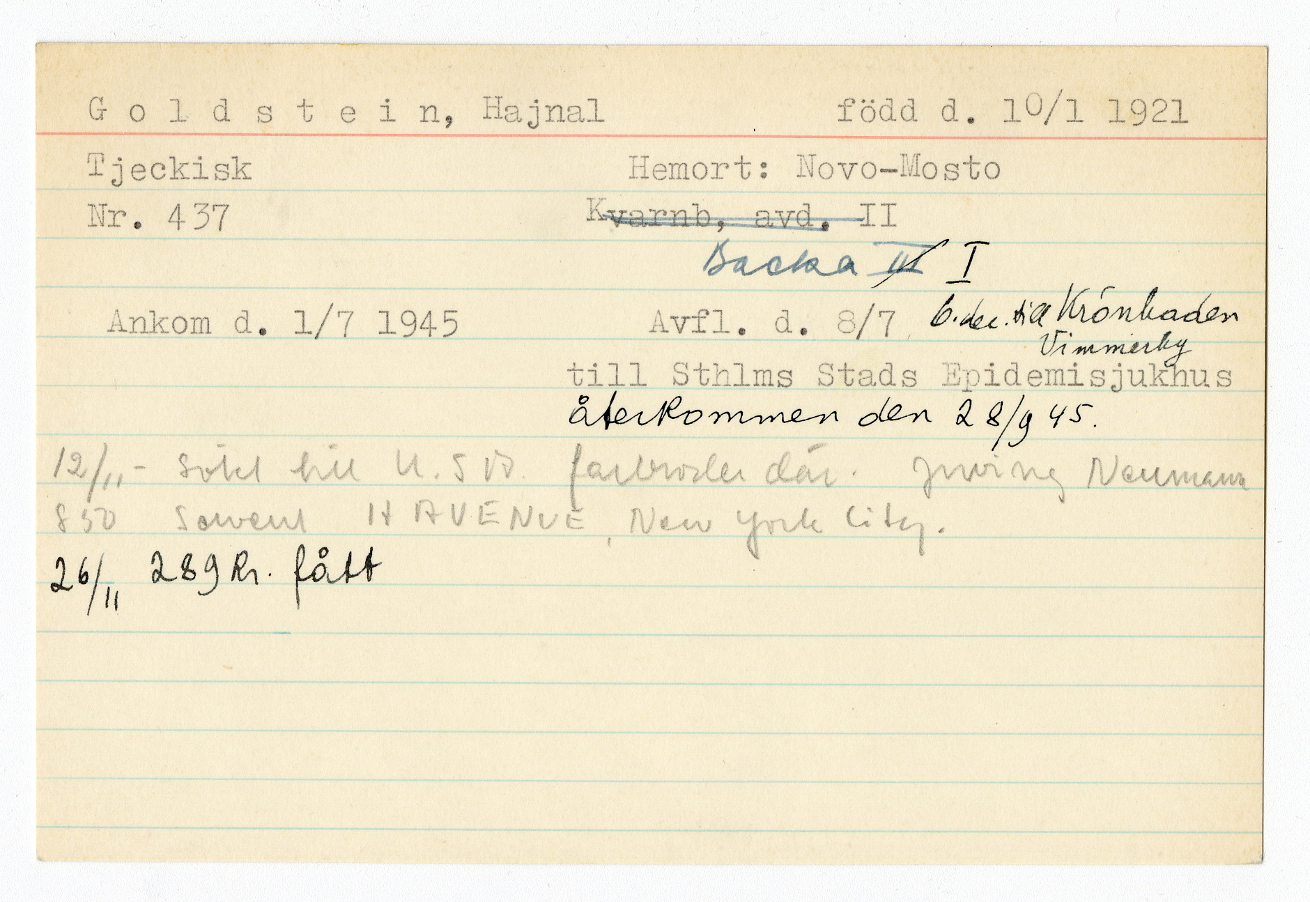 Ett skrivkort med patientuppgifter gällande Hajnal Goldstein.