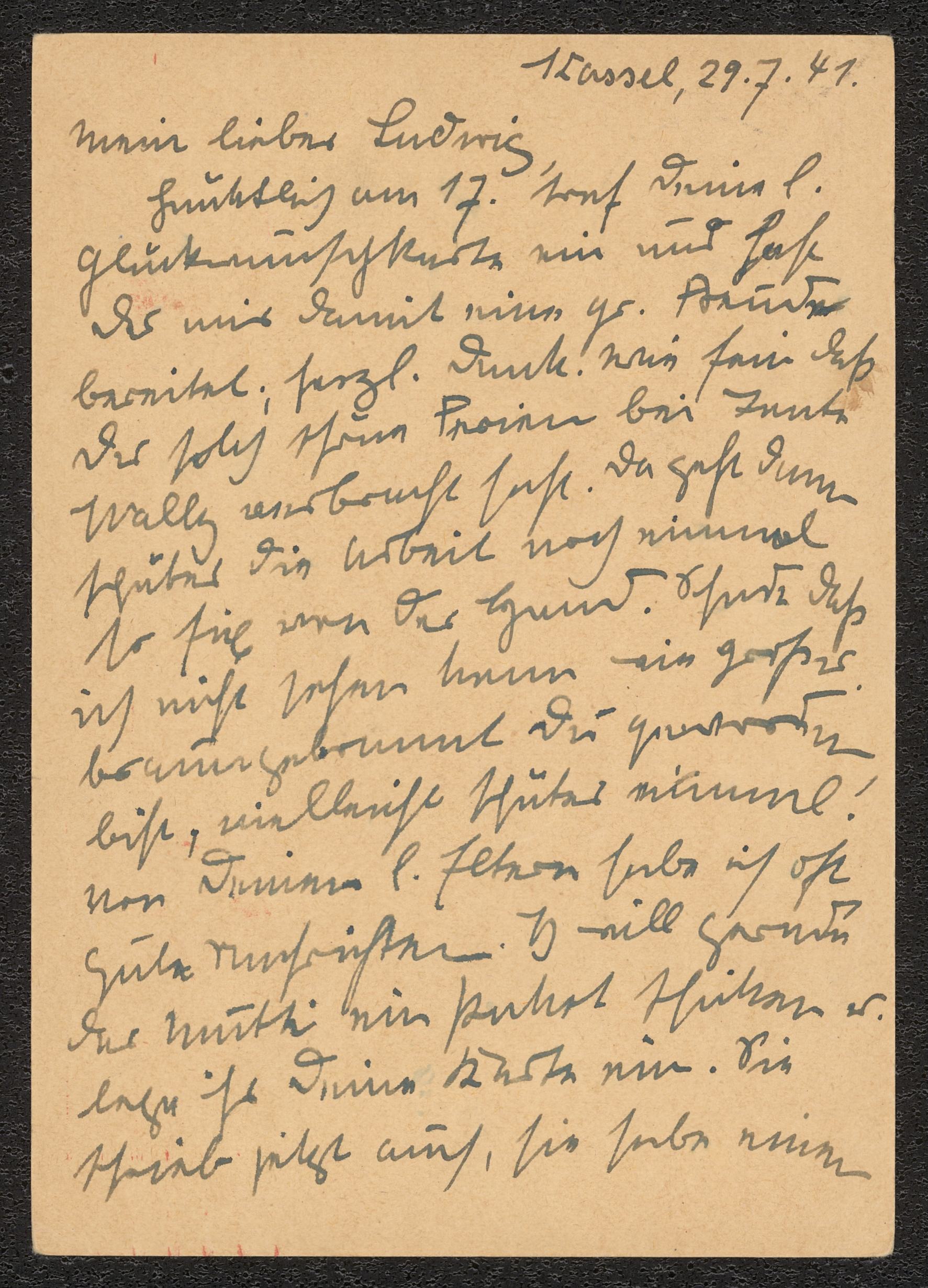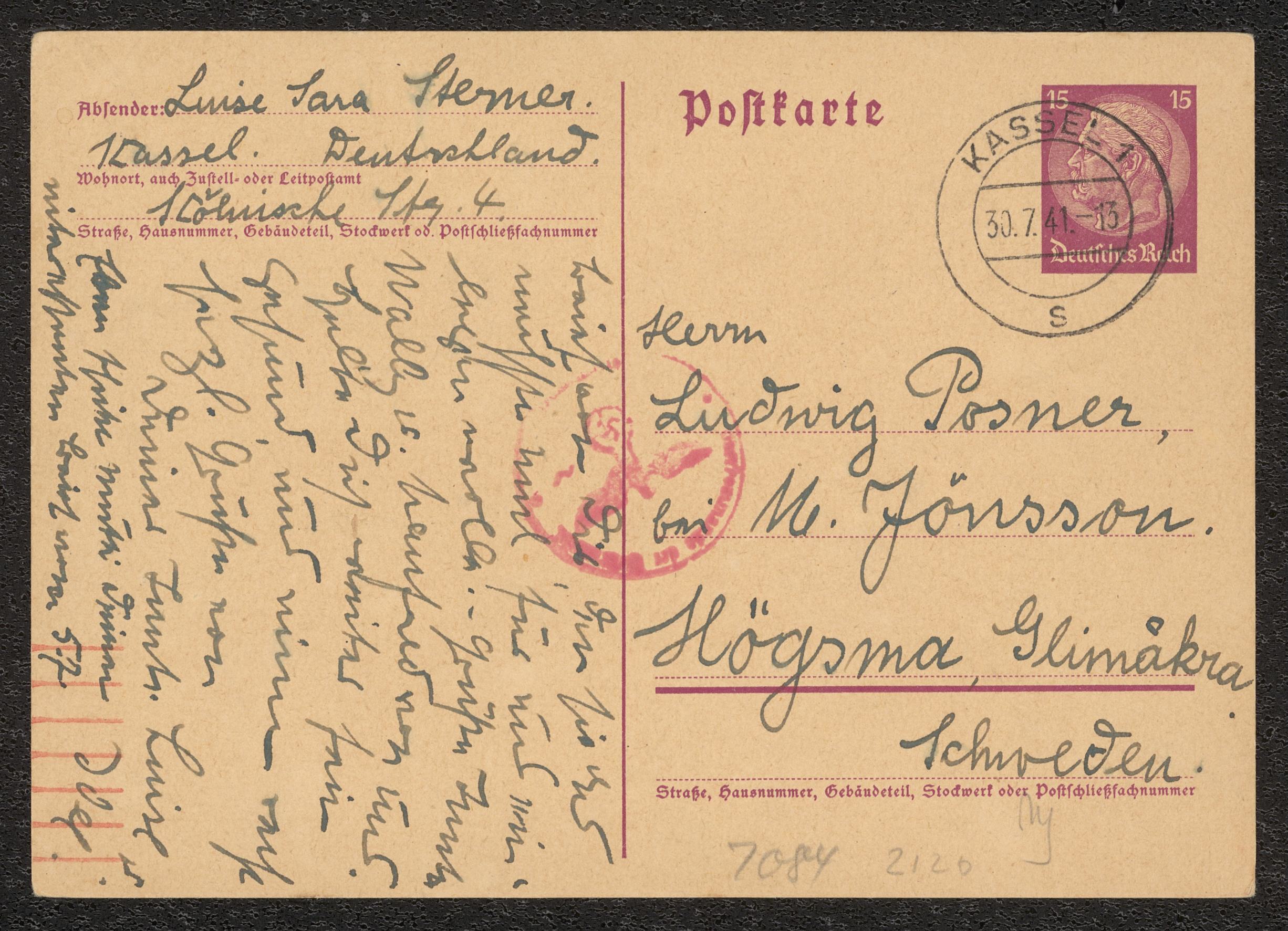 Brevkort skrivet av Ludwigs moster Louise Sterner, skickat från Kassel, Tyskland. Daterat 30 juli 1941. Inkom med förvärv SMF178.
