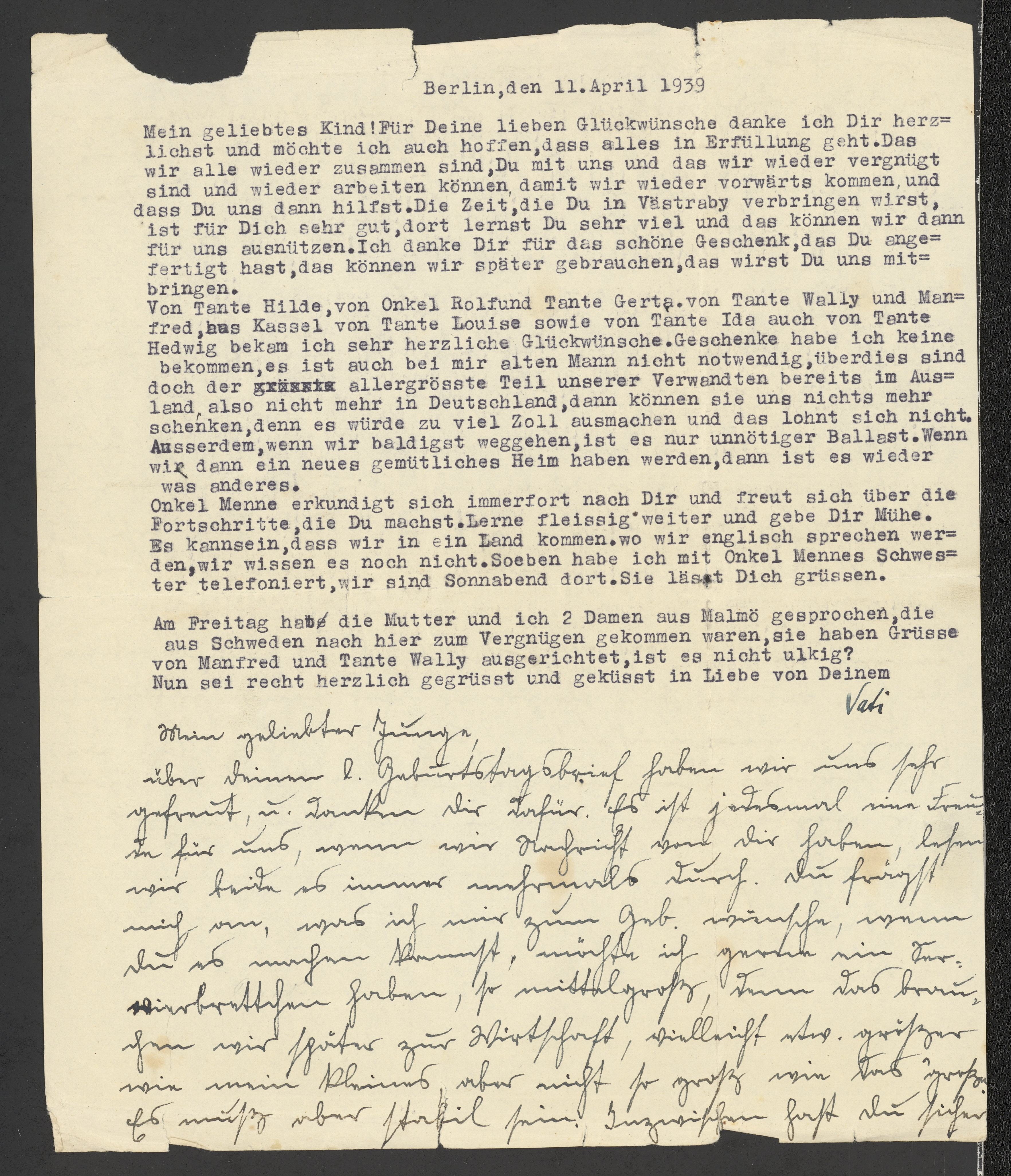 Brev från föräldrarna Anna och Siegfried Posner till sonen Ludwig Posner daterat 11 april 1939.