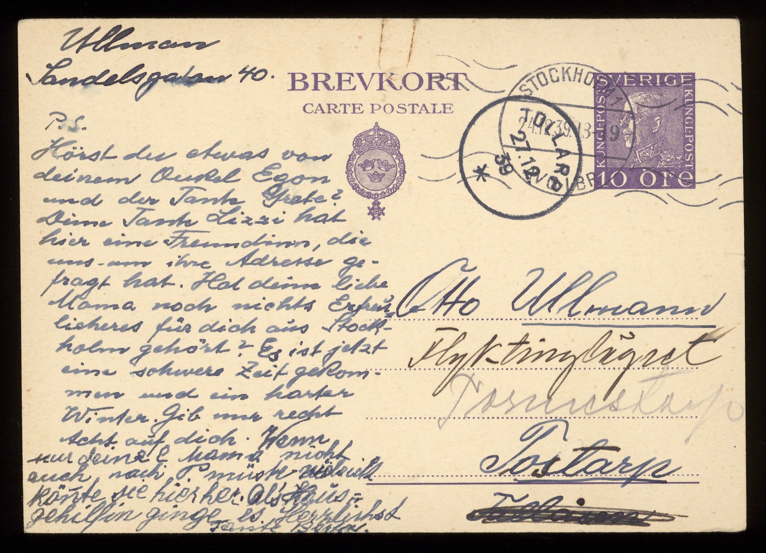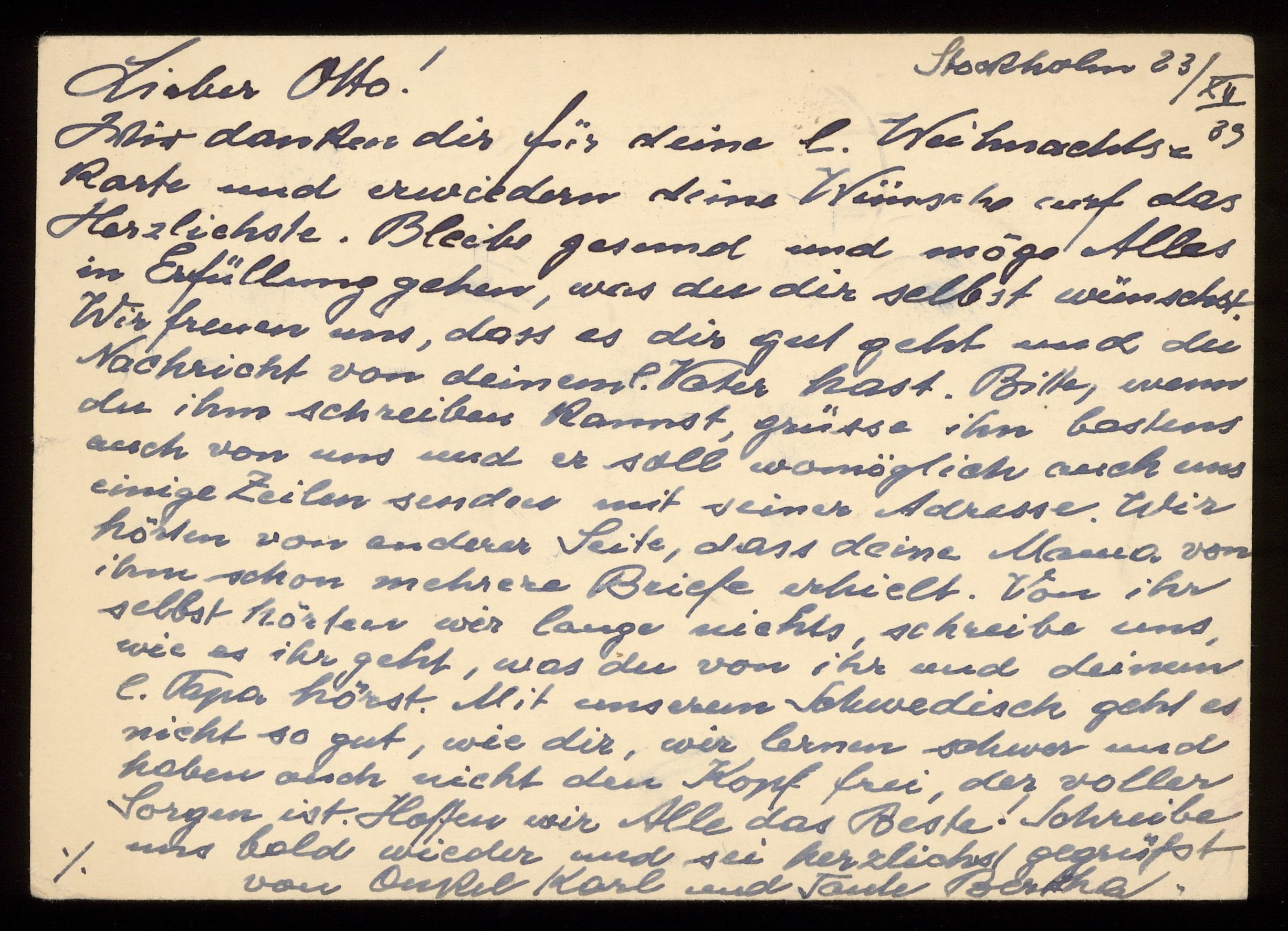Brev till Otto Ullman från Karl Ullman och Berta Ullmann 23 december 1939 Stockholm.