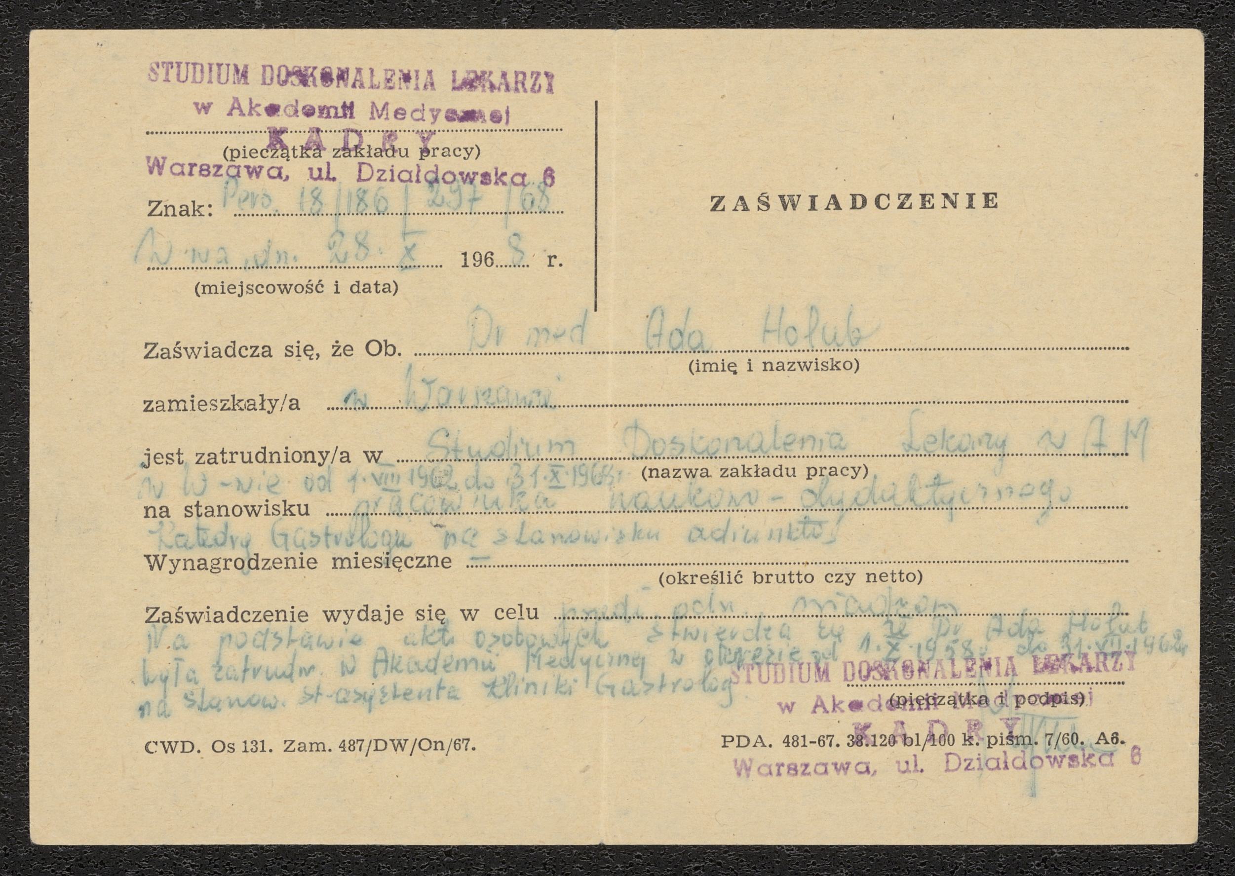 Anställningsintyg för Ada Holub oktober 1968