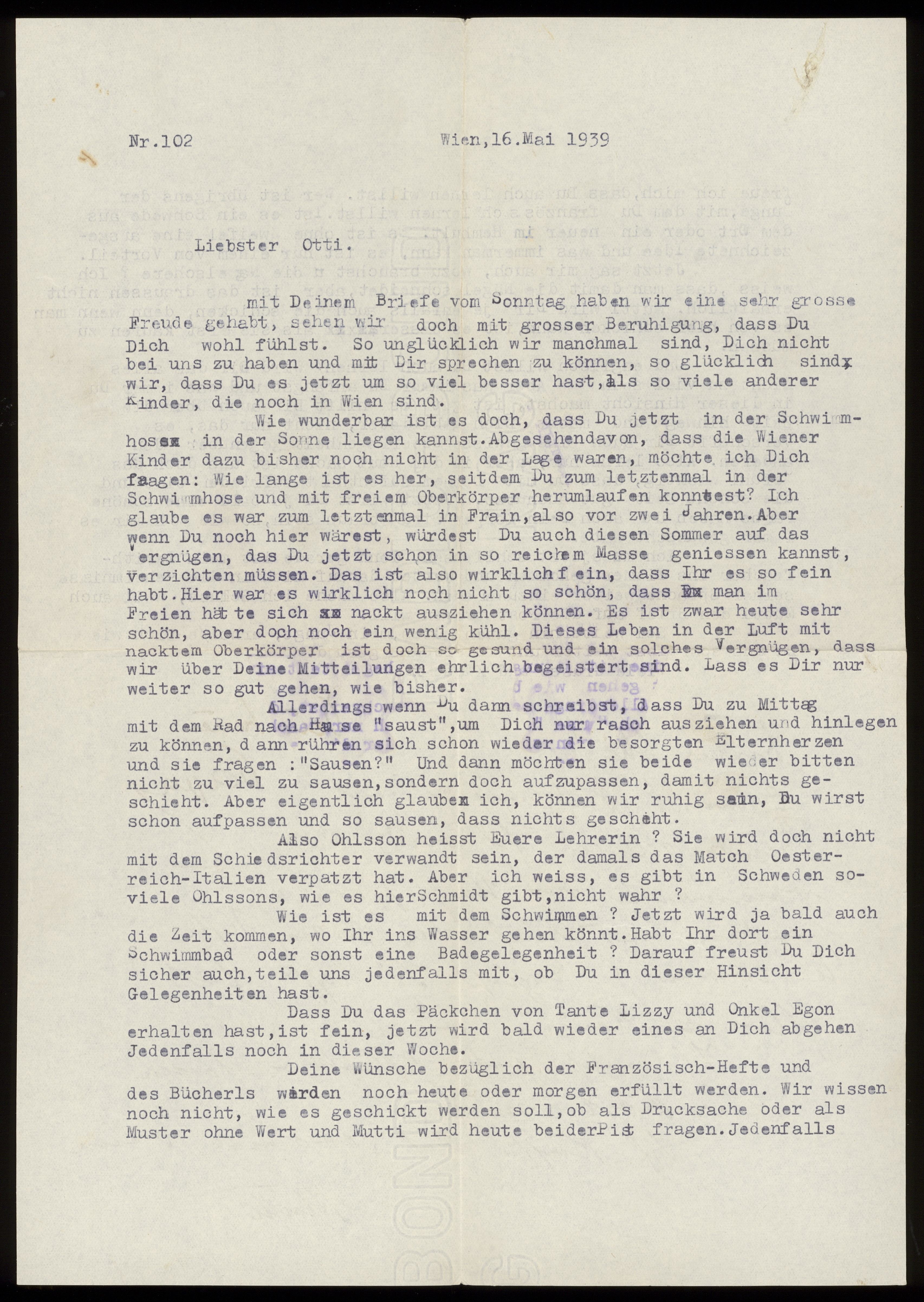 Maskinskrivet brev till Otto Ullman från föräldrarna Josef och Elise Ullmann daterat 16 maj 1939 Wien.