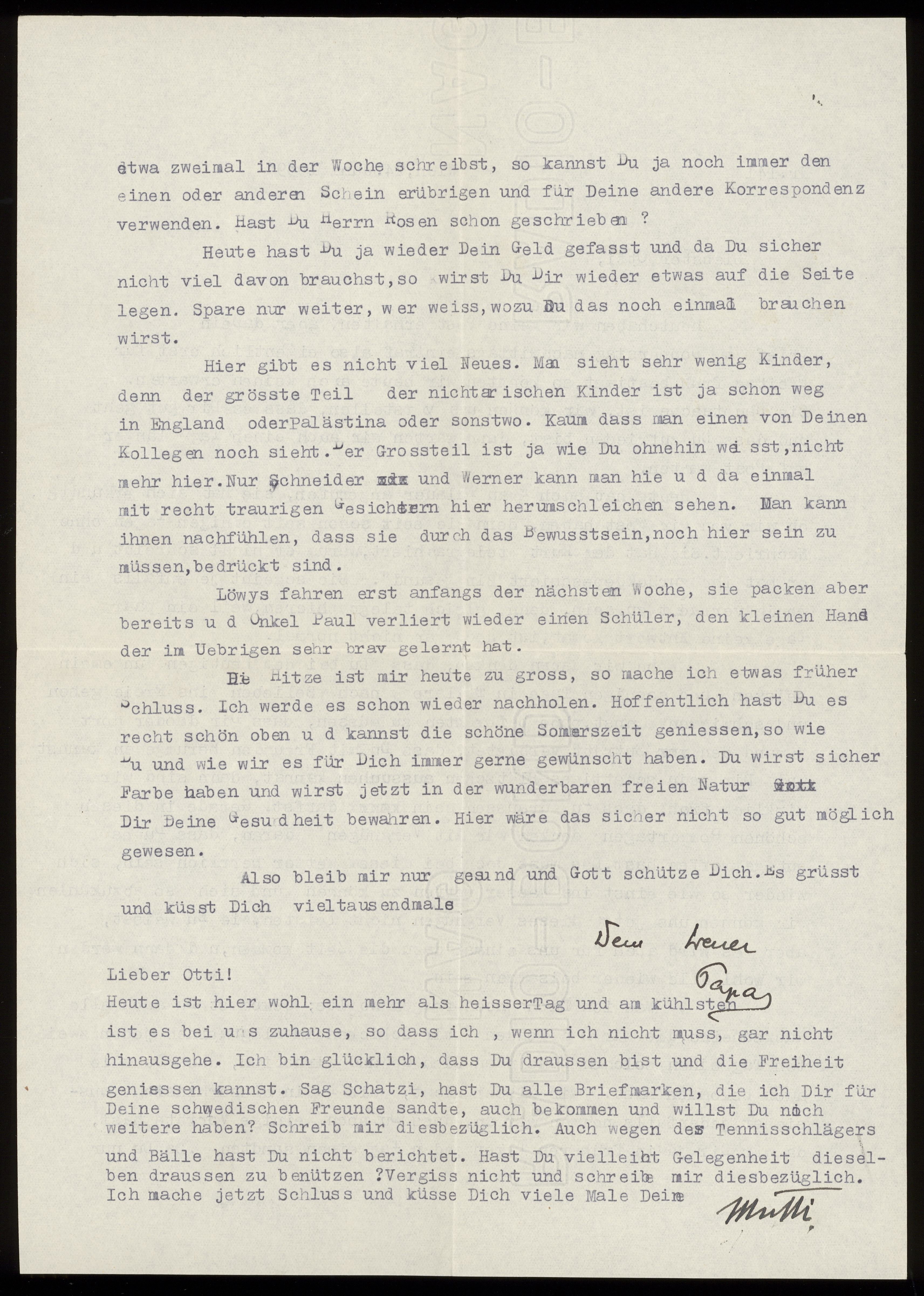 Maskinskrivet brev till Otto Ullman från föräldrarna Josef och Elise Ullmann daterat 24 juni 1939 Wien.